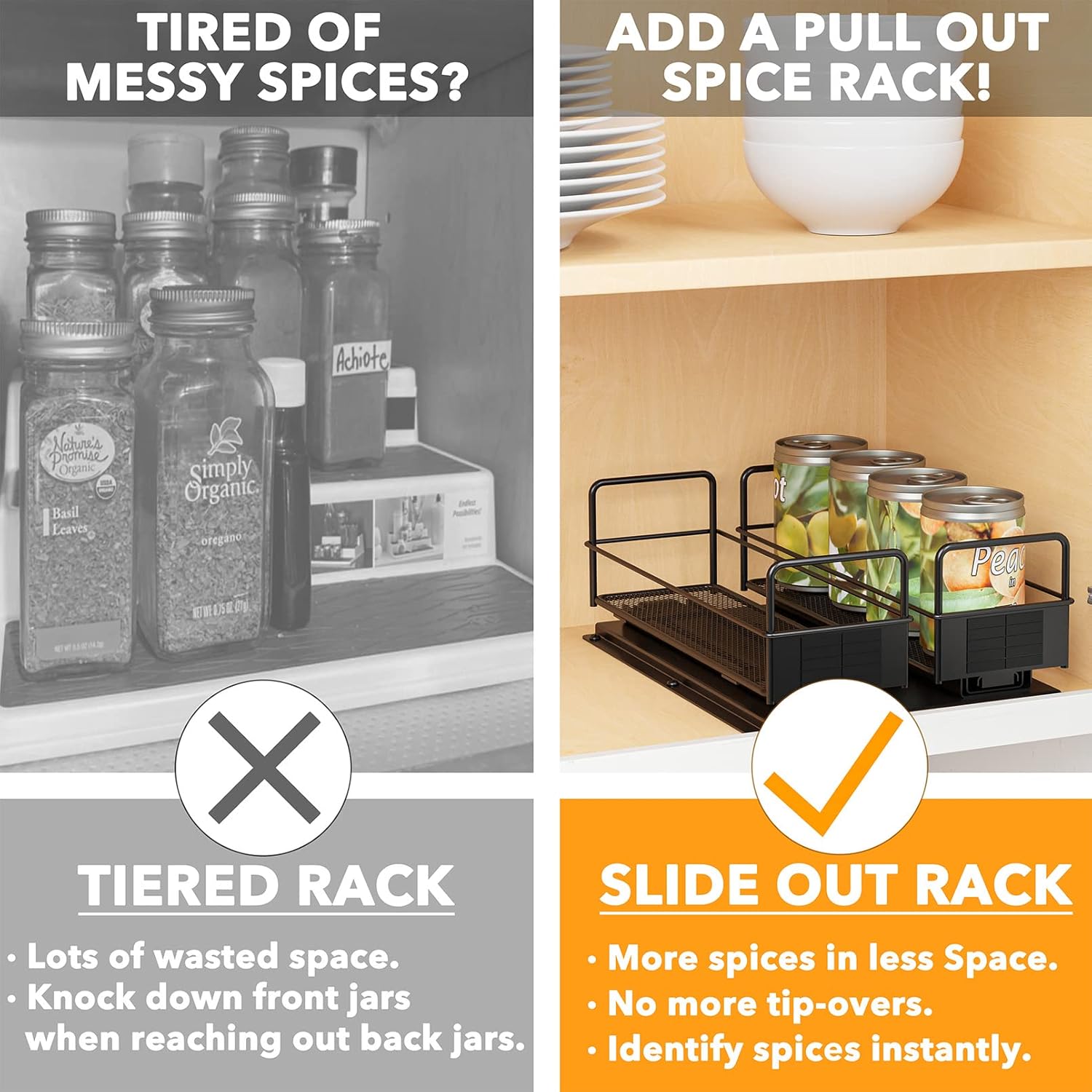 - MORE SPICES IN LESS SPACE - Easy slide out spice rack organizer that holds a large number of spices in the small area. No more tip-overs of front items. This sliding spice rack gives your easy access to all seasonings stored in your cabinet. SIZE: 7.7" Wide x10.8" Deep x4" High