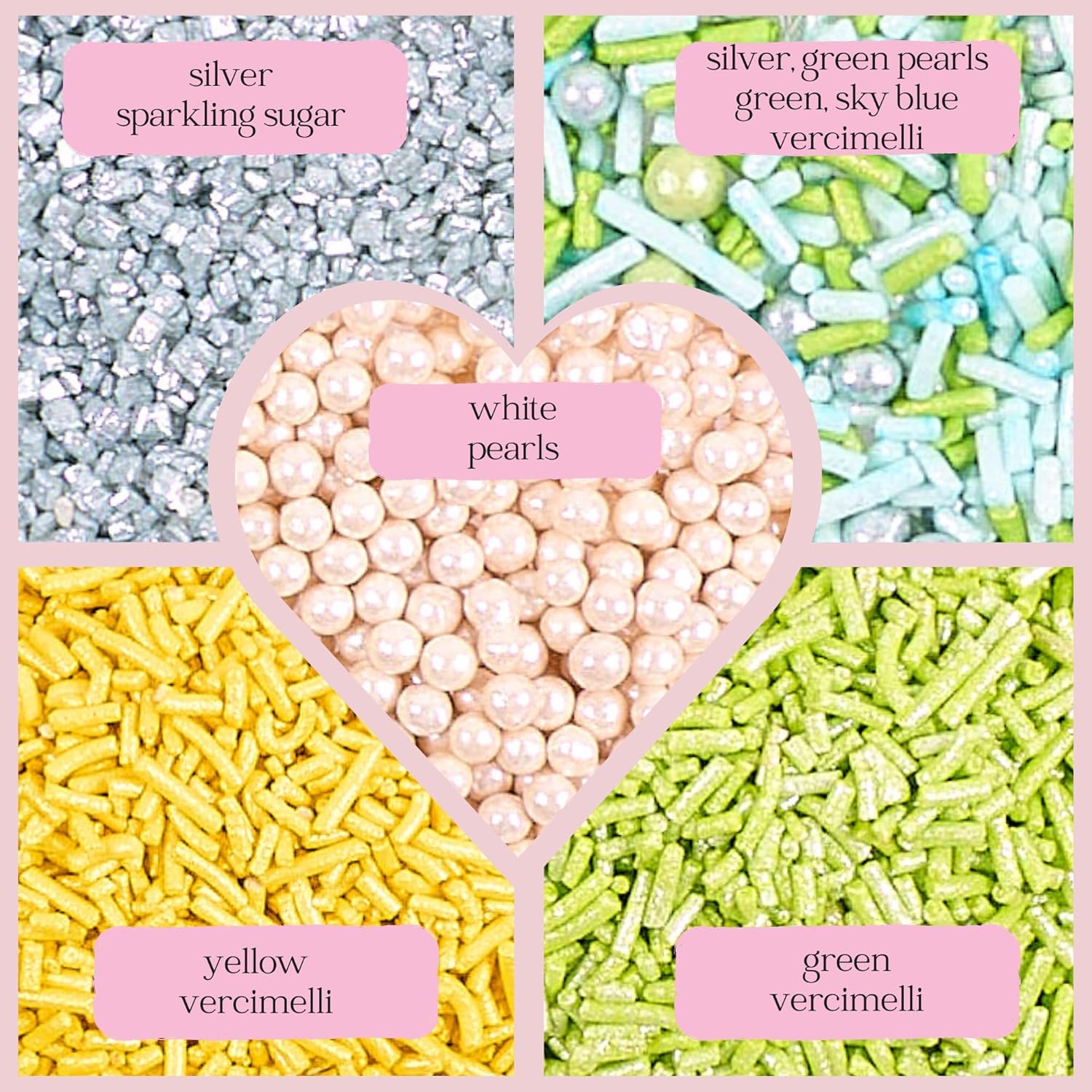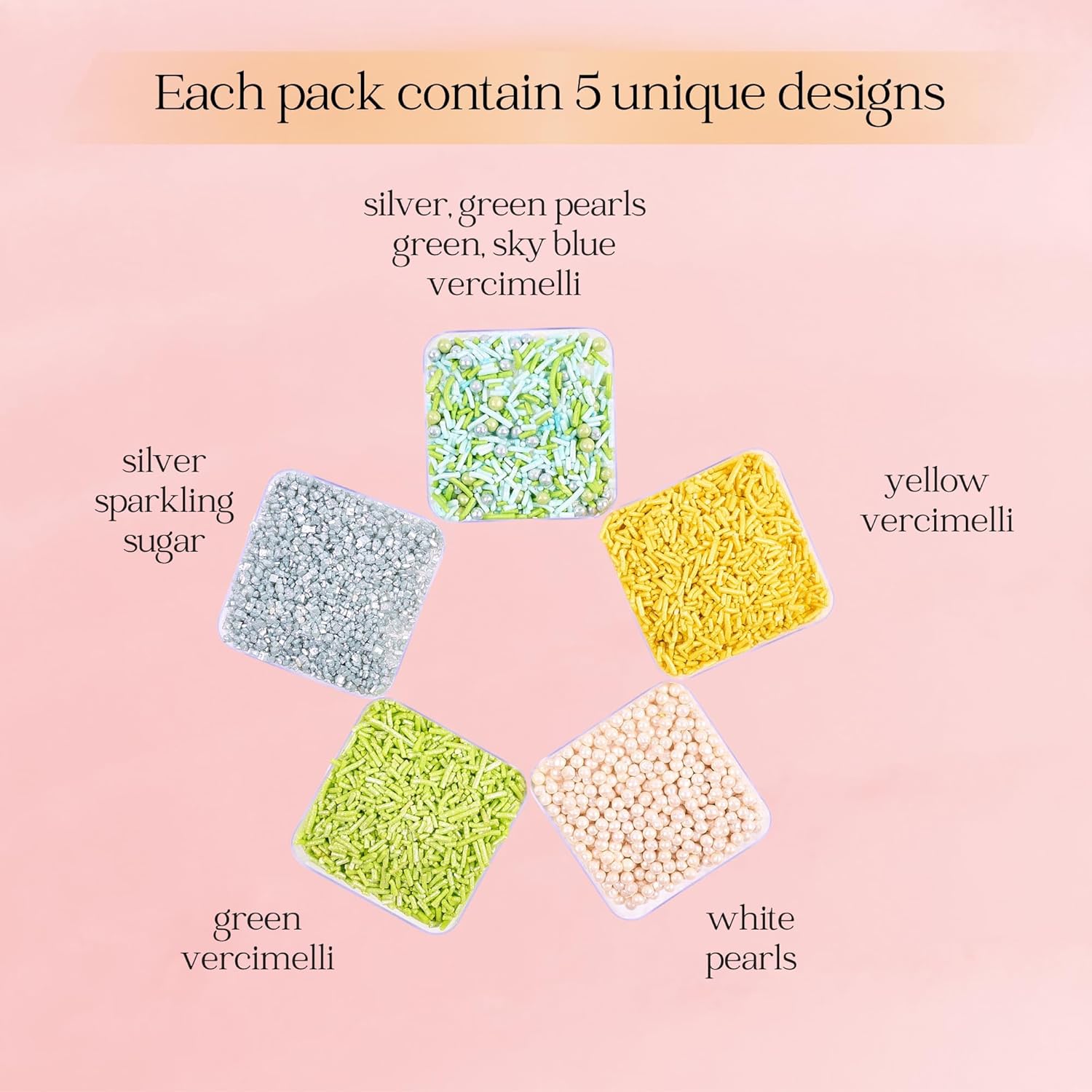 Confect Edible Sprinkles for Cakes & Cupcakes Decoration Assorted pack of 5 Summer Fun Sprinkles Mix White Dragees Green Yellow Blue Jimmies Silver Sparkling Sugar | Vegan, Gluten-Free, Nut-Free, Soy-Free, Dairy-Free, Palm Oil-Free - 5 Oz