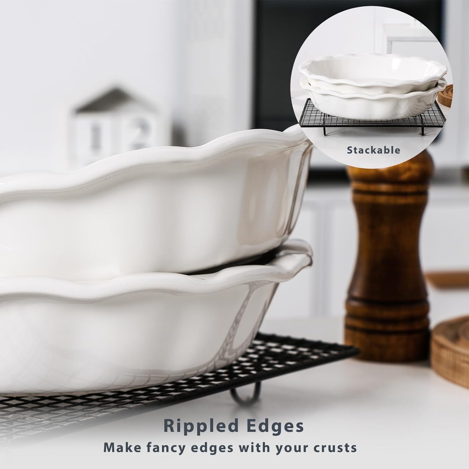 Lareina Ceramic Pie Pans for Baking, 9 Inch Deep dish pie plates with Ruffled Edge for Apple Pie, Durable Pie Dish, Non-Stick, Oven & Dishwasher Safe, Set of 2, White