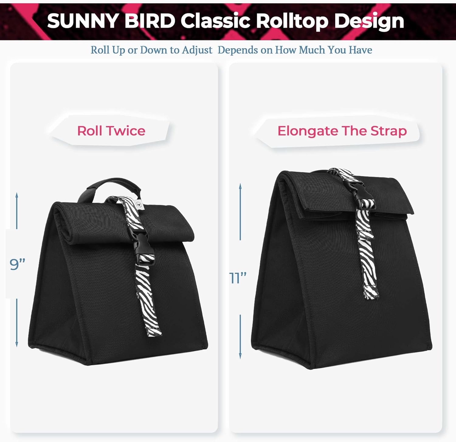 SUNNY BIRD Insulated Lunch Bag Rolltop Lunch Box Tote Bag for Women, Men, Adults and Teens (Black with white strap)
