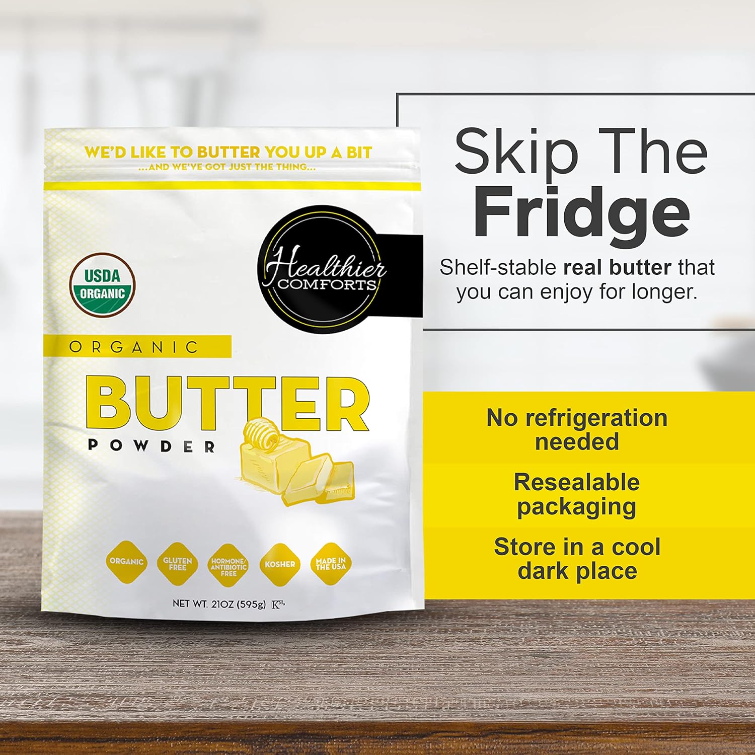 Healthier Comforts Organic Butter Powder | USDA Certified Organic Dehydrated Unsalted Butter | Kosher, Gluten Free, Non-GMO | Popcorn, Baking, Seasoning 21oz