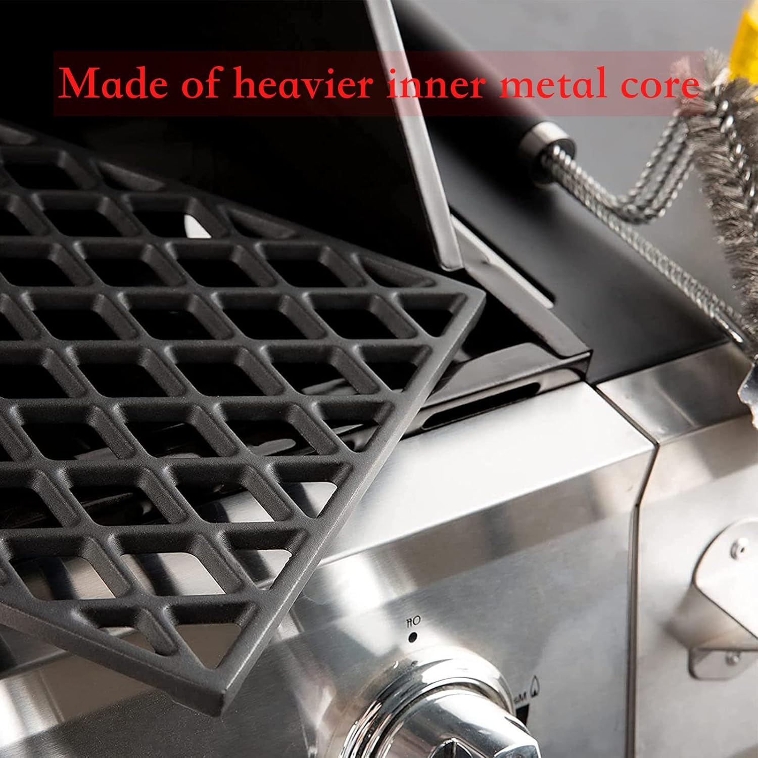 - 【Heat Evenly And Easy To Clean】Member’s Mark grill grates replacement parts of cast-iron construction heat food evenly and retains the heat. Oiling the grates before cook can not stick and create perfect sear marks. The cooking grates are easy to clean, just scrub it clean with a wire brush after each cooking. Not like the porcelain coating grate, the porcelain material is very brittle, banging it or hitting it with metal utensils or other hard objects that the coating will chips or cracks.