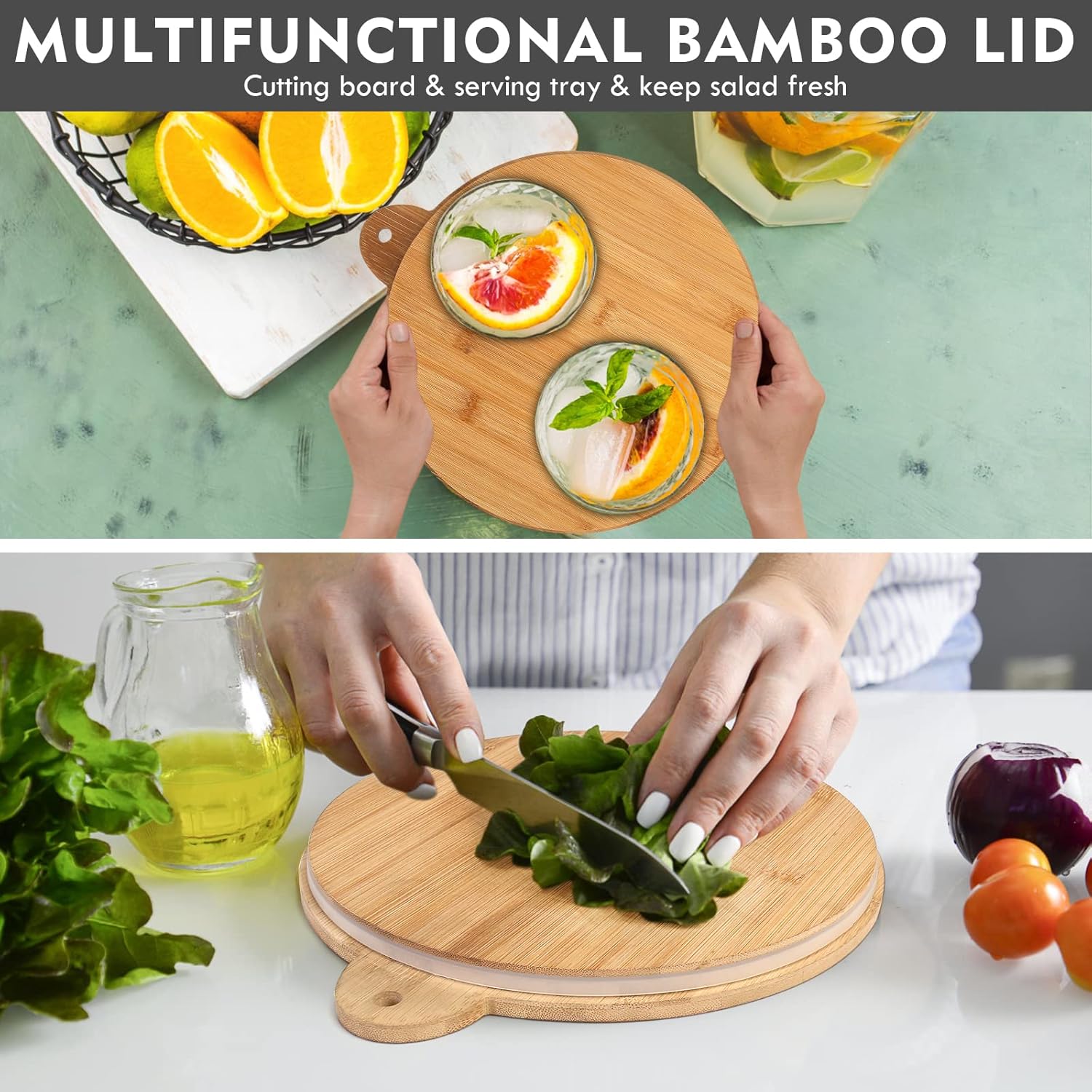 - 〖MULTIFUNCTIONAL UPGRADE AIRTIGHT LID〗: The solid bamboo lid can be used as chopping board for easy preparation. With upgrade design, it’s easier to pickup the utensils with extra ergonomic slot by the the grooves. And the tail of the lid makes the salad bowl easier to open. And there’s also a hole on the tail for hanging as your convenience.The silicone seal ring around will make the lid stay on the bowl, which makes the salad bowl easier to hold while traveling.