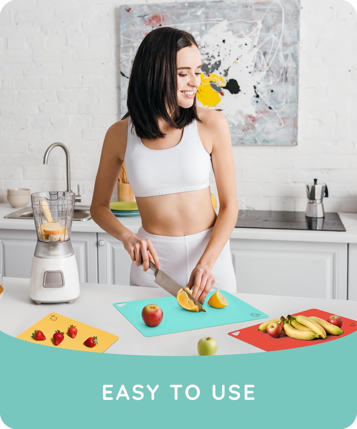 - π§Ό EASY TO CLEAN, DRY & STORE! Π‘utting boards for kitchen use are just what youβve been looking for! The compact design of our 3 piece mat board set takes the load out of cooking. Chop, slice, and dice confidently with cutting mats for cooking that are sure to stay in place as you prep.