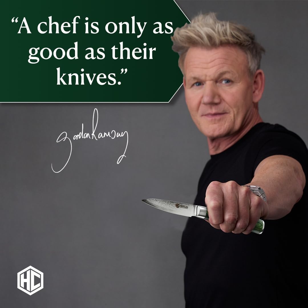 - 67 layers of Damascus steel for a harder blade that stays sharper longer with an ergonomic Pakkawood handle for precision and control. Made utilizing the 3-step Honbazuke method – an advanced heat treatment to achieve a combination of hardness and flexibility that creates an exceptional 12-degree cutting edge.