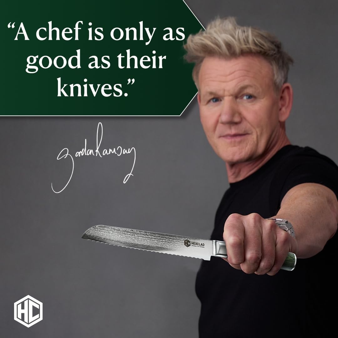 HexClad Bread Knife, 8-Inch Japanese Damascus Stainless Steel Blade, Pakkawood Handle