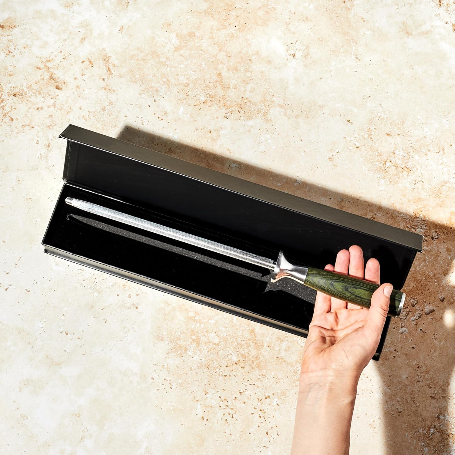 - For the best cutting performance, the minuscule "teeth" on your knife's edge should be periodically straightened. Sharpen the blade from the handle to the tip by placing the bottom of the blade at an angle on top of the sharpening rod. Repeat this process, then switch to the opposite side of the tip until the blade is as sharp as you like it.