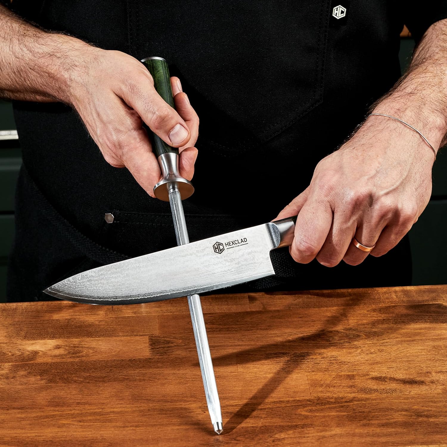 HexClad Honing Rod, 9 -Inch Japanese Damascus Stainless Steel Rod, Pakkawood Handle