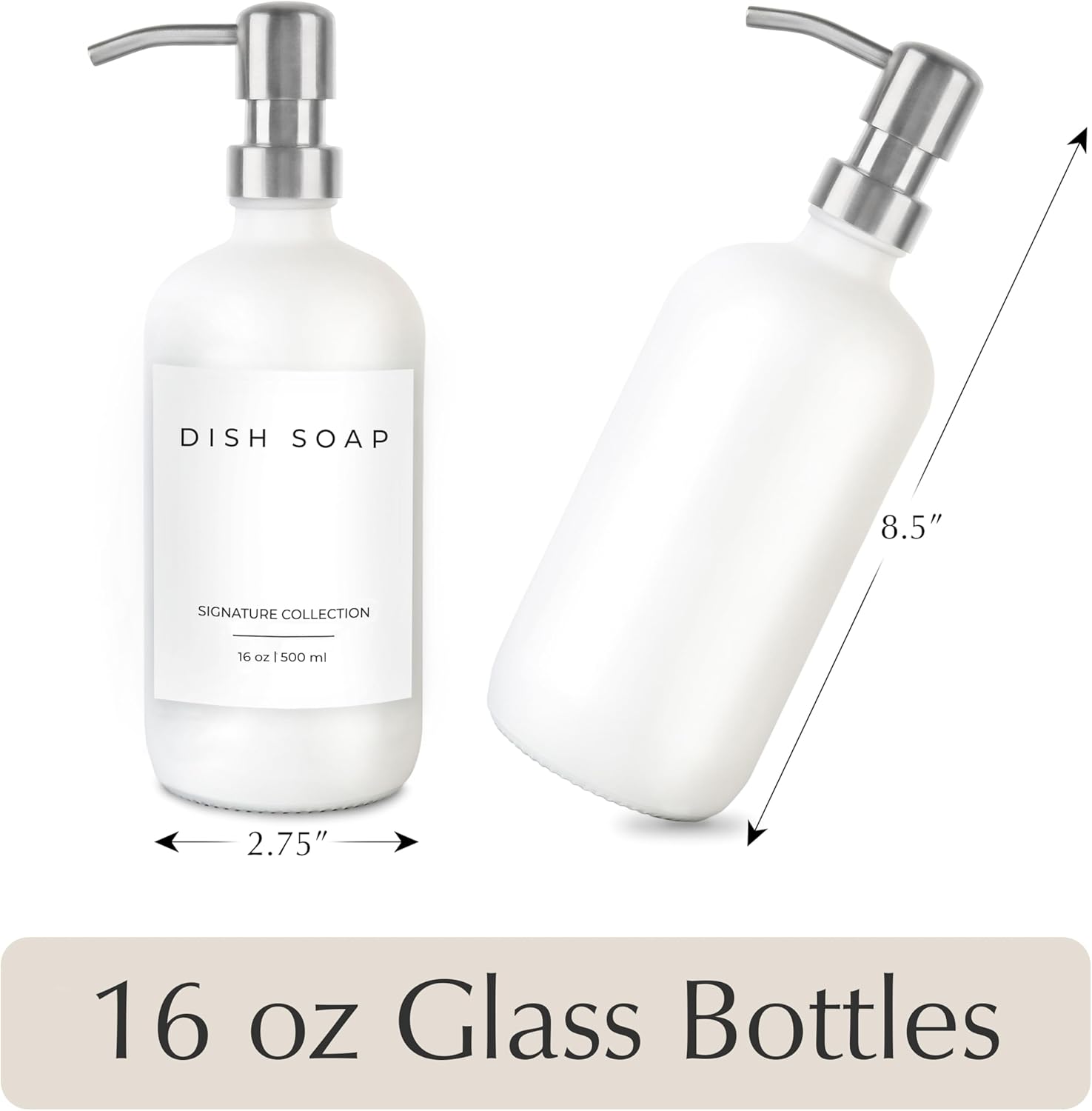 - ✅ 2-in-1 COMBO: Upgrade your home with our glass soap dispenser set. The dish soap dispensers are crafted from the highest quality glass and can be used as soap dispensers for kitchen sinks, soap dispensers for bathrooms, or as hand soap dispenser of your favorite liquid. The kitchen soap dispensers come with 2 dish soap dispensers for kitchen bottles (16 ounces), 2 stainless steel pumps, and 5 waterproof labels. Our selection includes colors including amber, clear, white, and black.