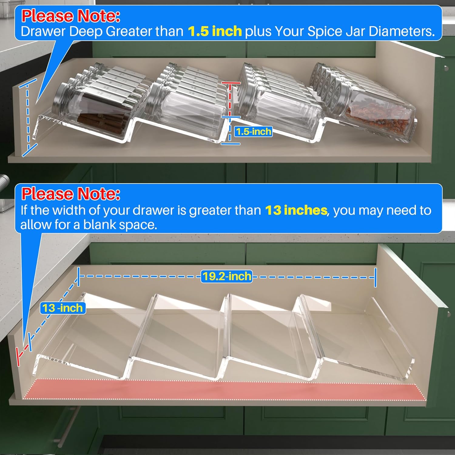 - Please note: Before purchasing, ensure that your drawer's depth is greater than 4 inches.【Large Capacity up to 28 Spice Jars】The Spice Rack Tray for Drawer adopt tiered design provides plenty of storage space, 4 Tiers (4 Pieces ), Each Pices 13"L x 4.5" W . 13" x 19" holds up to 28 standard 4 oz spice jars