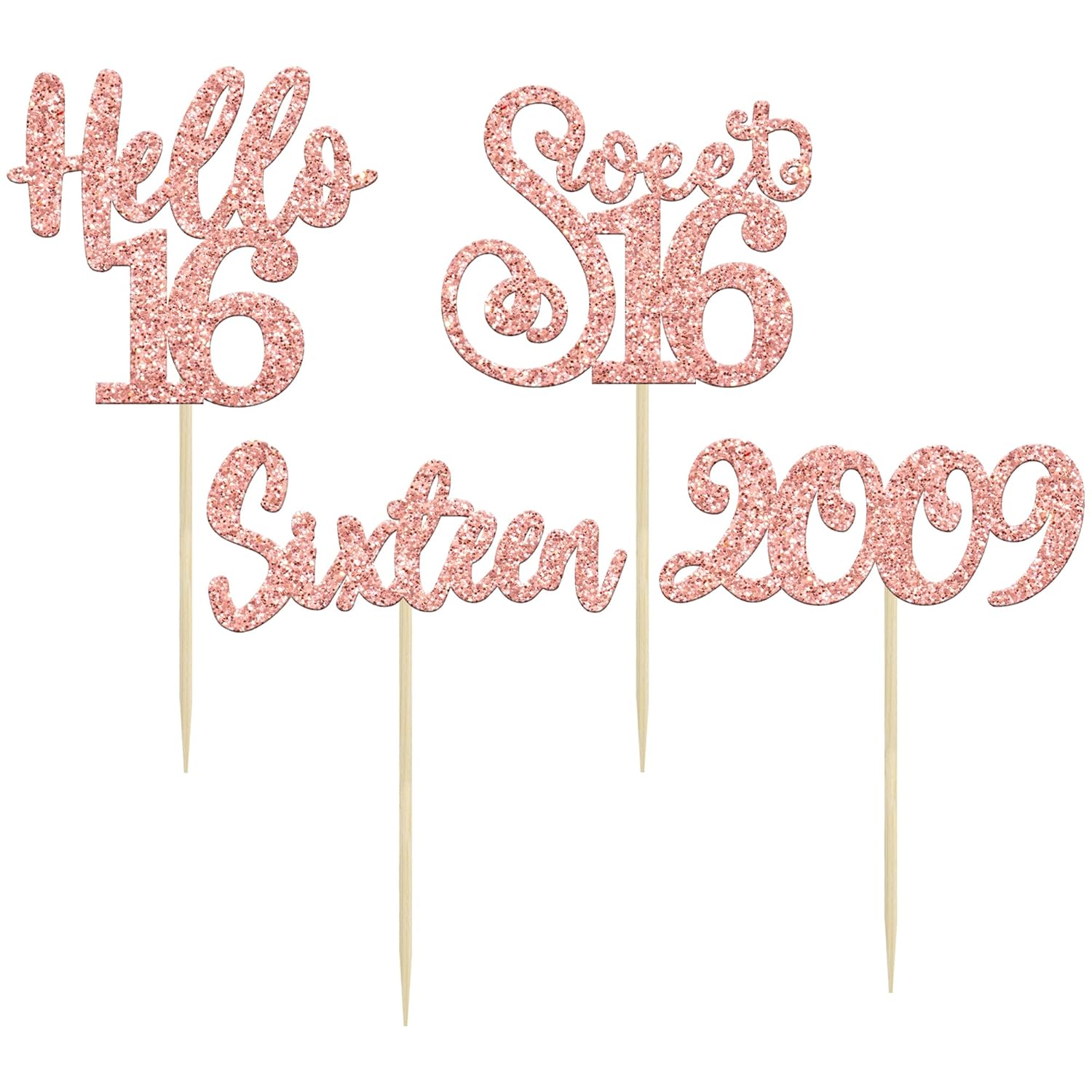 Gyufise 24pcs 16th Birthday Cupcake Toppers - Rose Gold Glitter Hello Sweet 16 Cupcake Picks - 2009 16th Birthday Cake Decorations for Anniversary Party Supplies