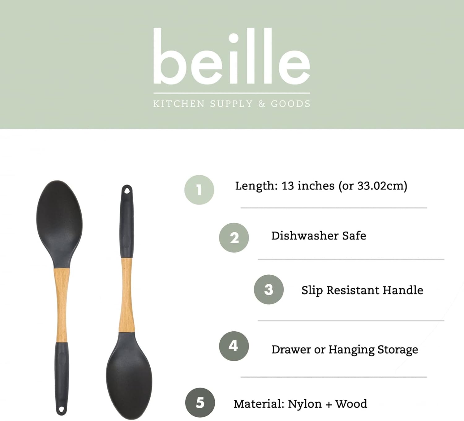 Beille Grey Nylon Spoon with Wooden Handle Kitchen Utensils High Heat Resistance, 13 Inch