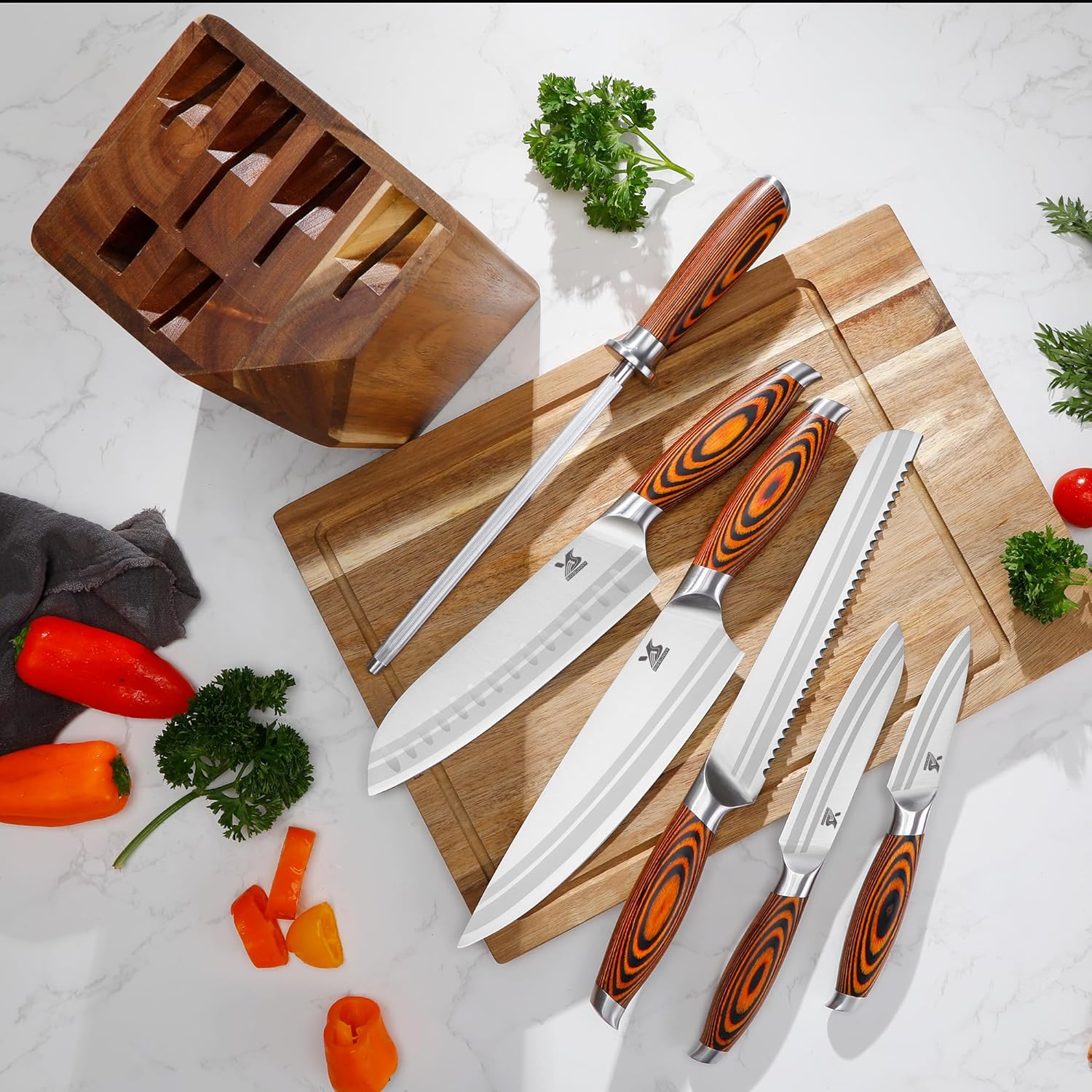- 【Well-Designed Knife Set】Includes: 1*chef knife, 1*bread knife, 1*santoku knife, 1*utility knife, 1*fruit knife, 1*Honing steel, 1*Knife Block. These blades will provide you with the perfect, clean separation you’ve been searching for slicing, precise peeling, filleting, skinning and trimming. It is essential for any serious chef.