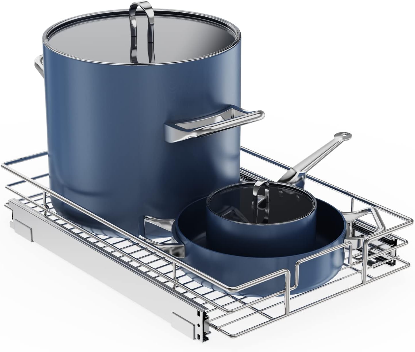 - ăSpace-saving Pull Out Cabinet OrganizerăThis slide out cabinet organizer can maximize your cabinet space. Makes it super easy to store, organize, and access your stand mixers, pots, pans, baking sheets and other kitchen accessories, cleaning supplies, and various odds and ends. Now your cabinet is no longer just stacks of pots pans. You can contact seller via Amazon Messages to make sure if the size fit your cabinet.