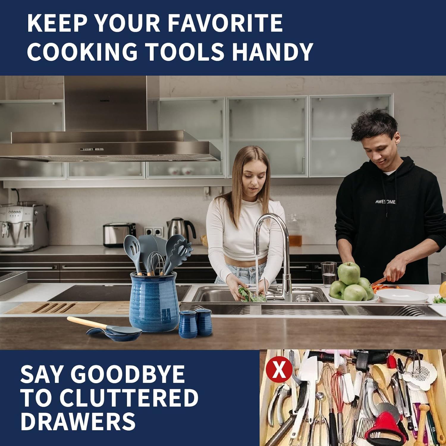 Hasense Large Utensil Holder Crock for Kitchen Counter, 7.1" Ceramic Cooking Utensil Organizer for Countertop, Farmhouse Vintage Utensil Caddy for Spatula Spoon, Rustic Home Table Decor, Blue