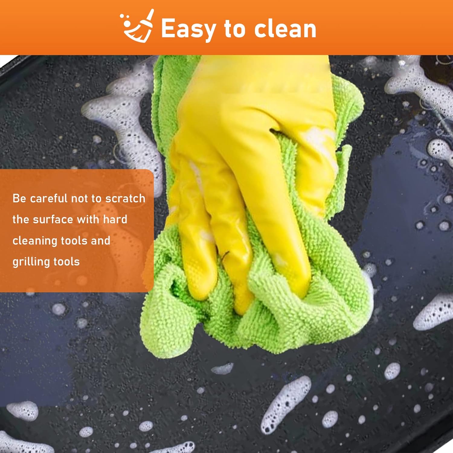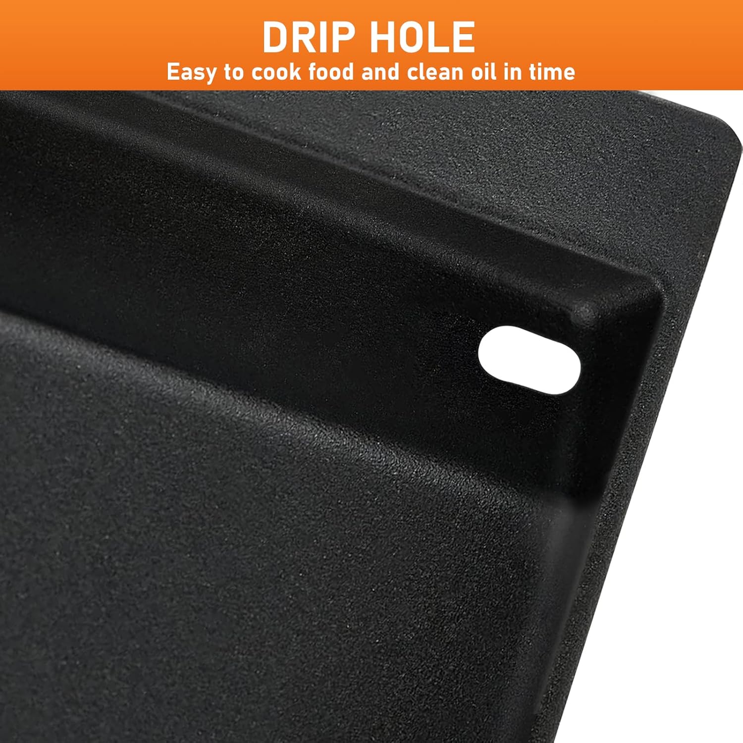 - [Drain Hole]This cast iron cooking griddle is newly designed with oil drain holes, when you feel that there is too much oil and moisture on it, you can use a brush to clean it before continuing to grill.