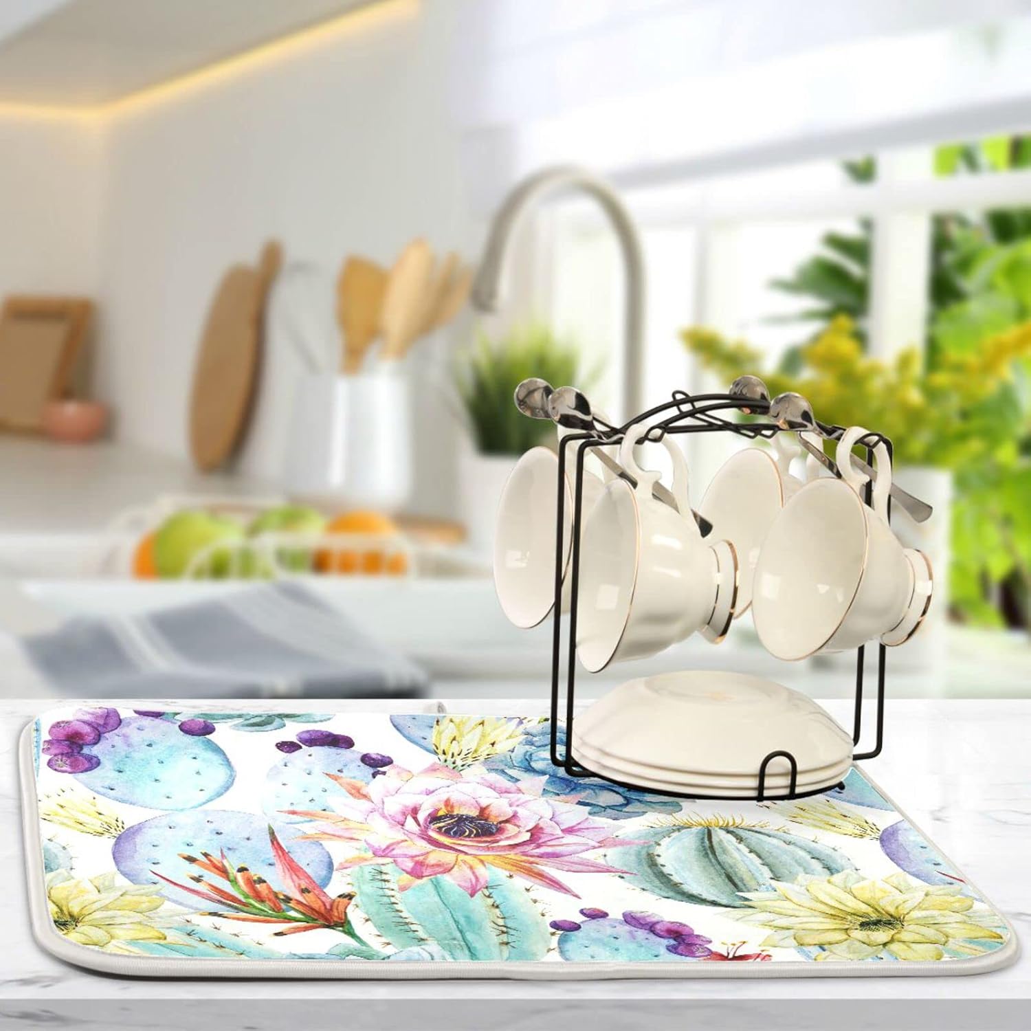 Cactus Succulent Plant Dish Drying Mat for Kitchen Counter Absorbent Microfiber Drying Pad, Medium 16x18 in, Reversible Drainer Mats