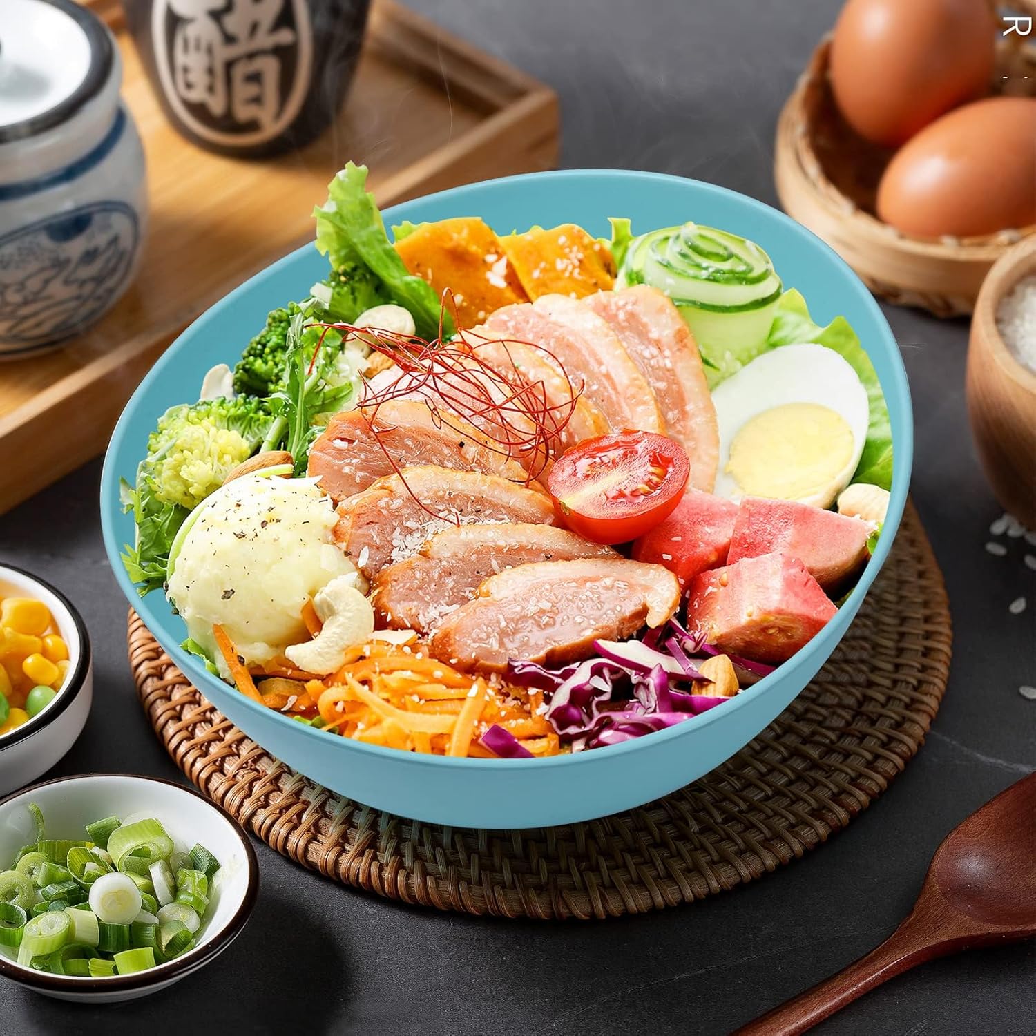 9.6'' Serving Bowls, Bamboo Fiber Salad Bowls Set of 4, 2.6Qt/84 Ounce, Large Bowls for Kitchen,Curvy Shape Big Deep Bowl for Salad,Vegetable,Fruit,Cereal, Lightweight & Easy to Clean(Multi Turquoise)