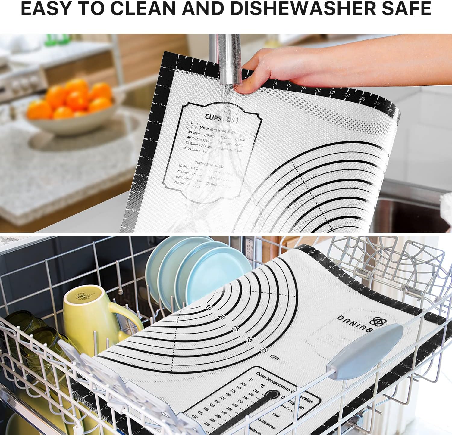 - EASY to CLEAN & STORAGE:This large non stick sheet silicone mat keeps worktop clean. Even burnt sugar and fat falls off or leftover dough,without the inevitable clean up,Just a quick wipe down, rinse the mat in warm soapy water or throw in the dishwasher, No more scrubbing,So easy!