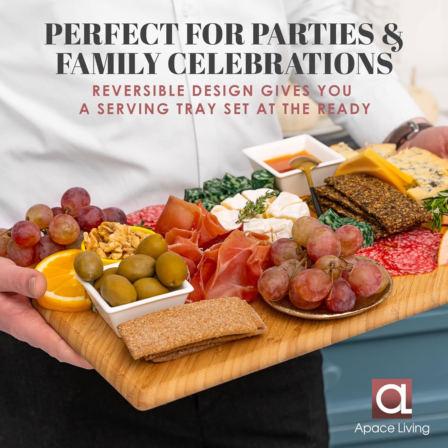 - DOUBLES AS A SERVING TRAY SET: Reversible design instantly transforms your cutting board set into a practical serving solution. Distinctive tapered sides make carrying and serving easy. Perfect for dinner parties, party meals, family meals, or whenever you need great looking platters to serve cheese, charcuterie, smorgasbord treats etc.
