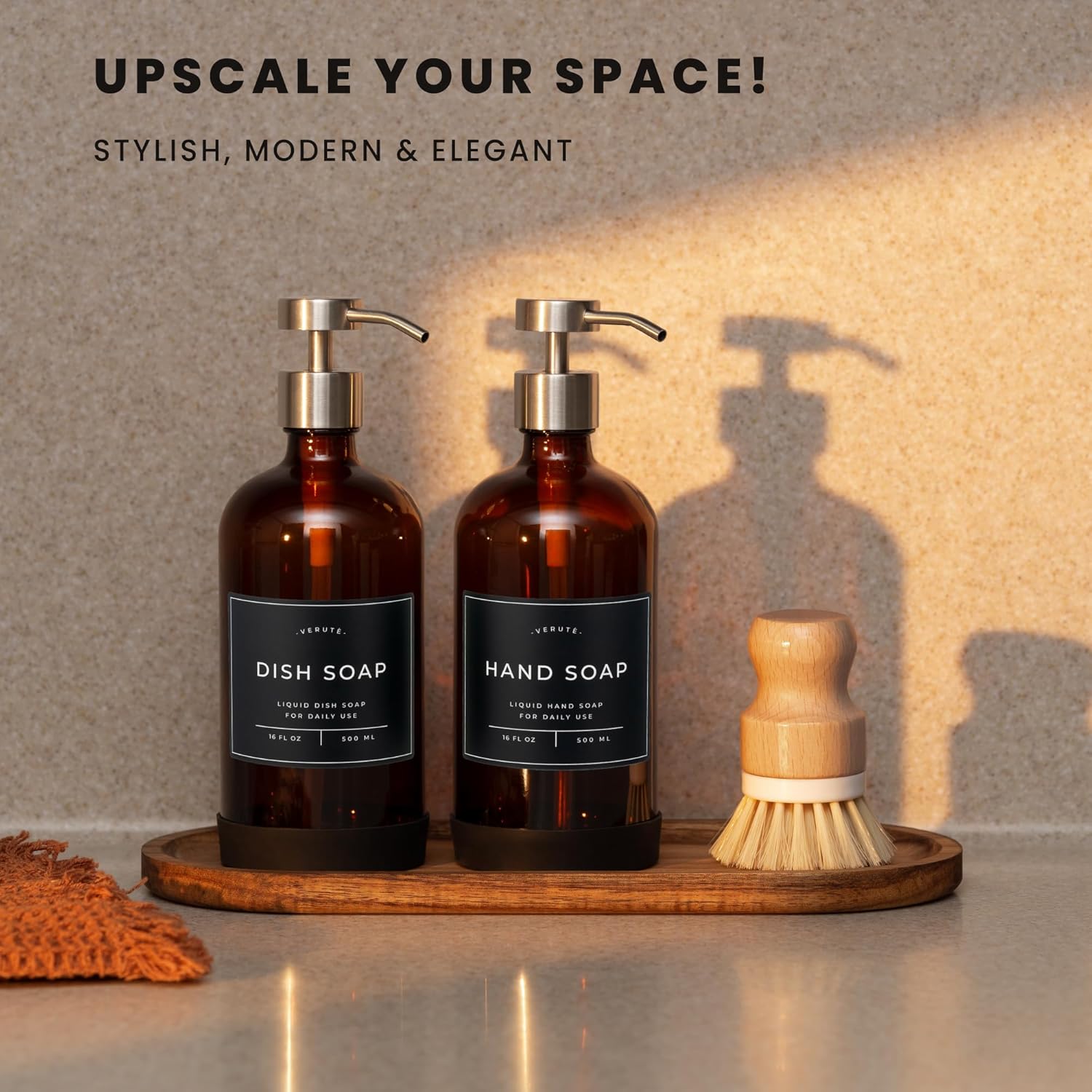 16oz Glass Soap Dispenser with Stainless Steel Pump, 21 Waterproof Labels, Non-Slip Protective Silicone Pad, Set of 2 for Bathroom & Kitchen (Amber Bottle/Brushed Silver Pump)