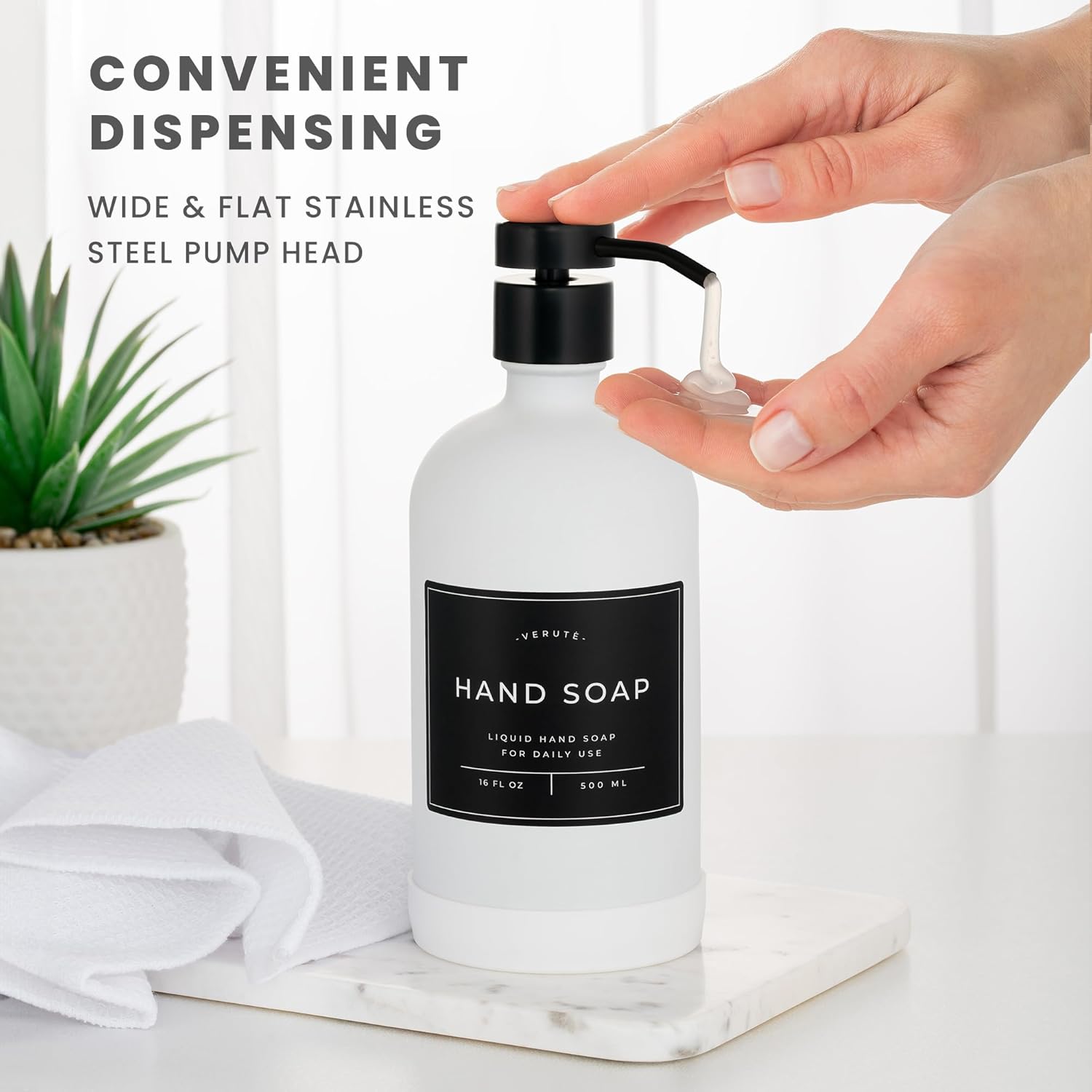 16oz Glass Soap Dispenser with Stainless Steel Pump, 21 Waterproof Labels, Non-Slip Protective Silicone Pad, Set of 2 for Bathroom & Kitchen (Matte White Bottle/Black Pump)