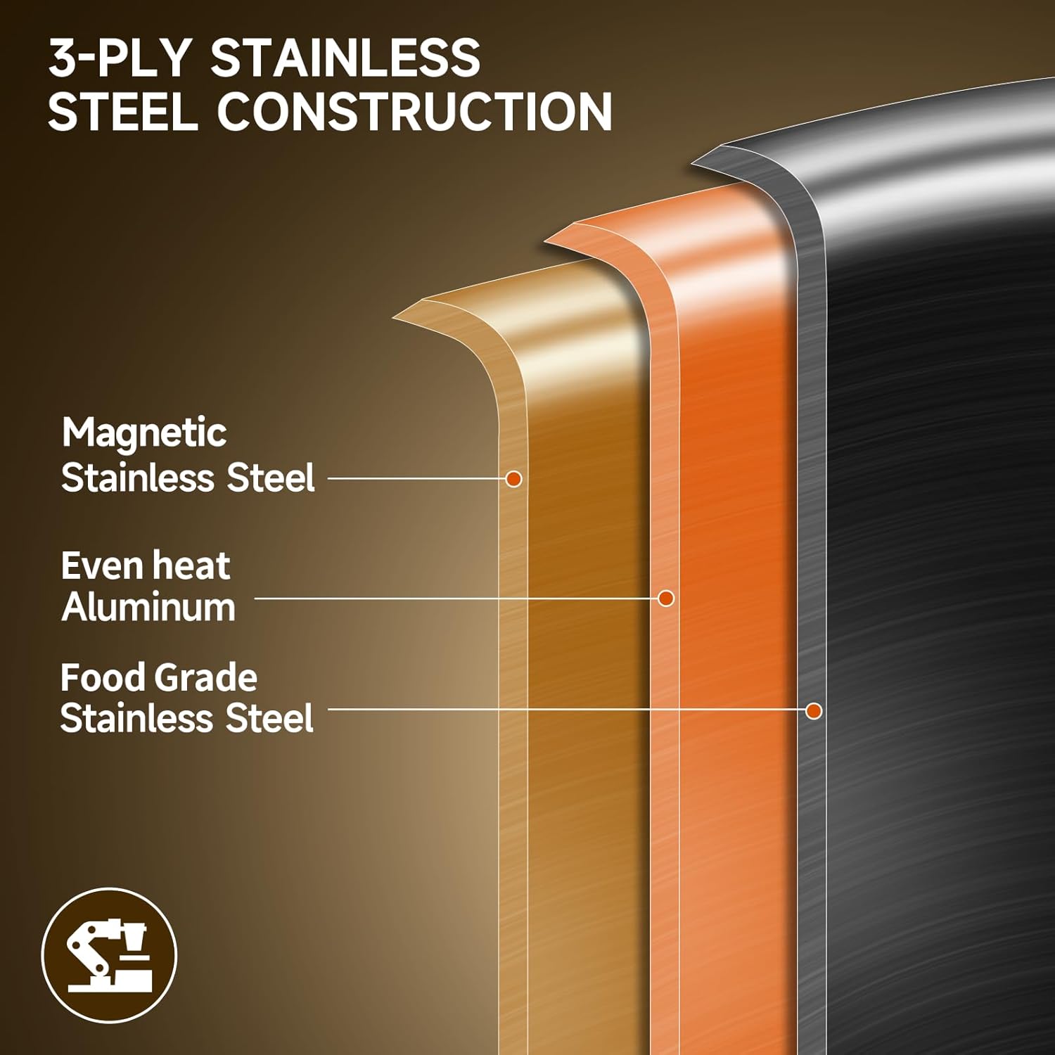 - Tri-Ply Clad:Made with a high pure aluminum core bonded together with 2 layers of durable stainless steel, excellent durability and even heat distribution,saved energy more than 20%.