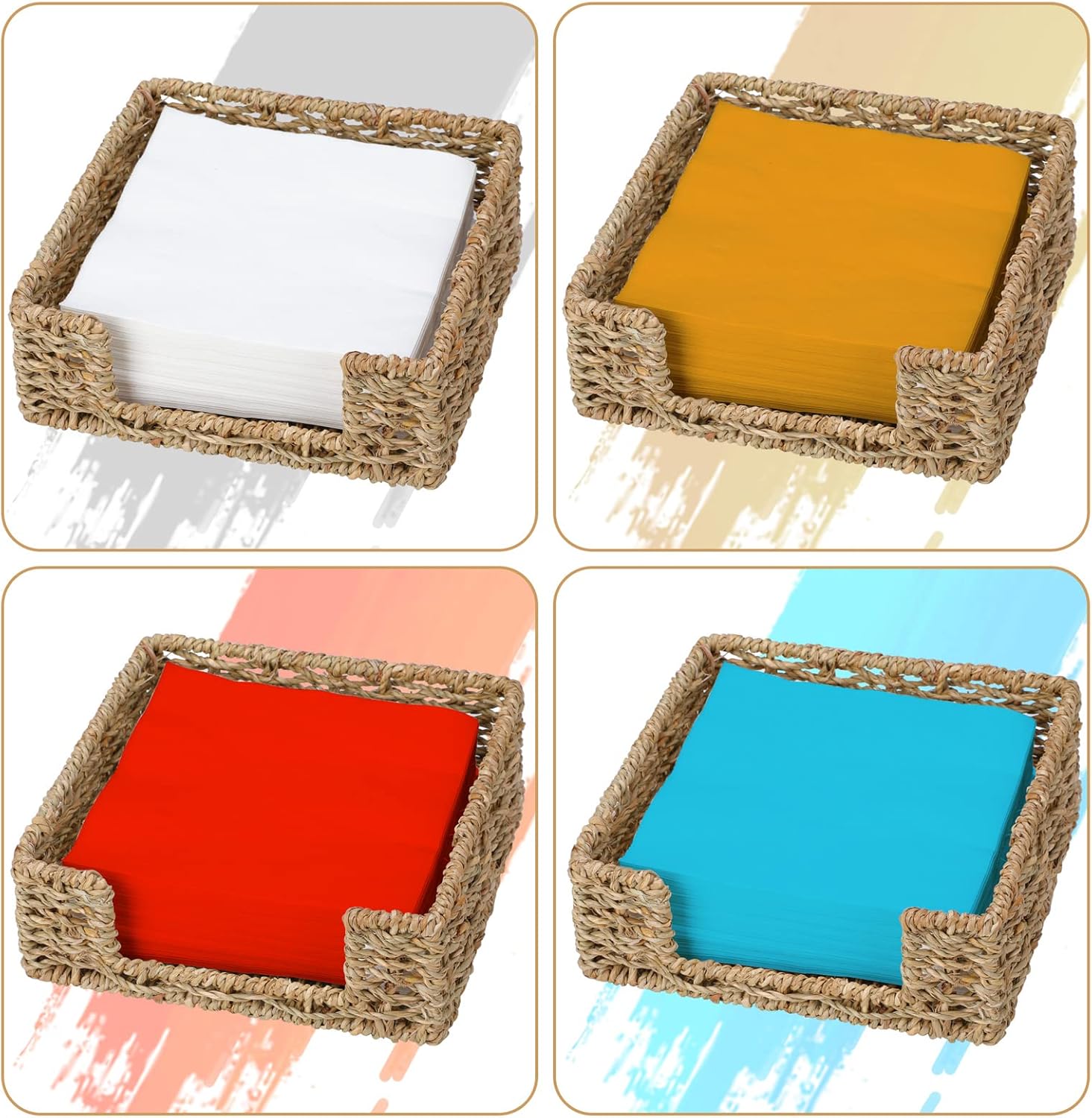 - β [Size] The napkin holder is 7.8"L x 7.8"W x 2.8"H, size may vary within 1/4 inch due to handwoven design. Each napkin holder is about 0.5 lb and can hold 100 napkins, also can be a perfect choice for lunch, dinner, cocktail, table, counter, home kitchen, restaurant, bar, decoration, etc.