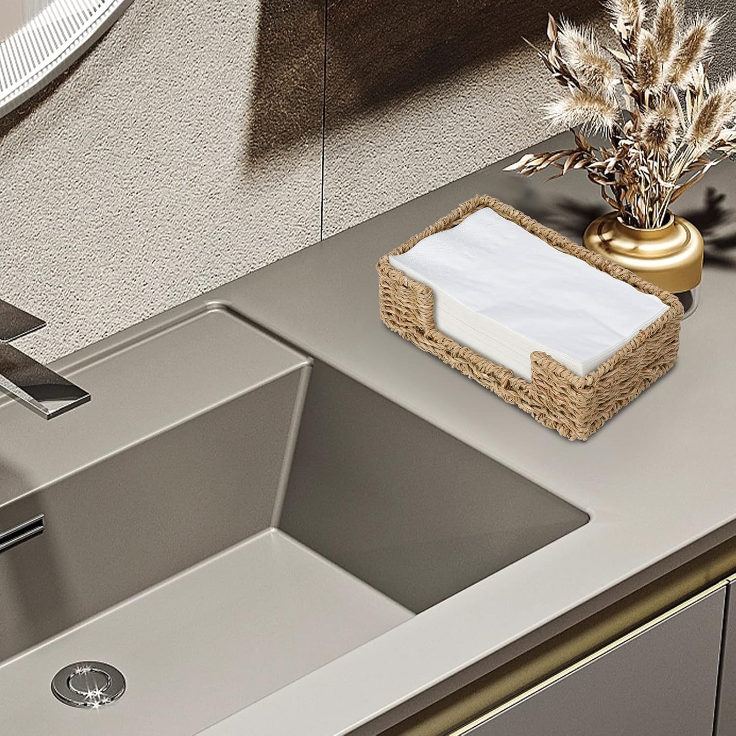 Bathroom Disposable Guest Towel Napkin Holder Long Seagrass Woven Rattan Wicker Table Dinner Paper Hand Guest Towel Napkin Basket Tray Caddy for Kitchen