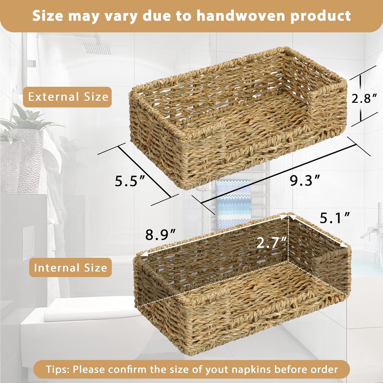 - β [Size] The napkin holder is 9.4"L x 5.5"W x 2.8"H, size may vary within 1/4 inch due to handwoven design. Each napkin holder is about 0.5 lb and can hold 100 napkins, also can be a perfect choice for lunch, dinner, cocktail, table, counter, home kitchen, restaurant, bar, decoration, etc.