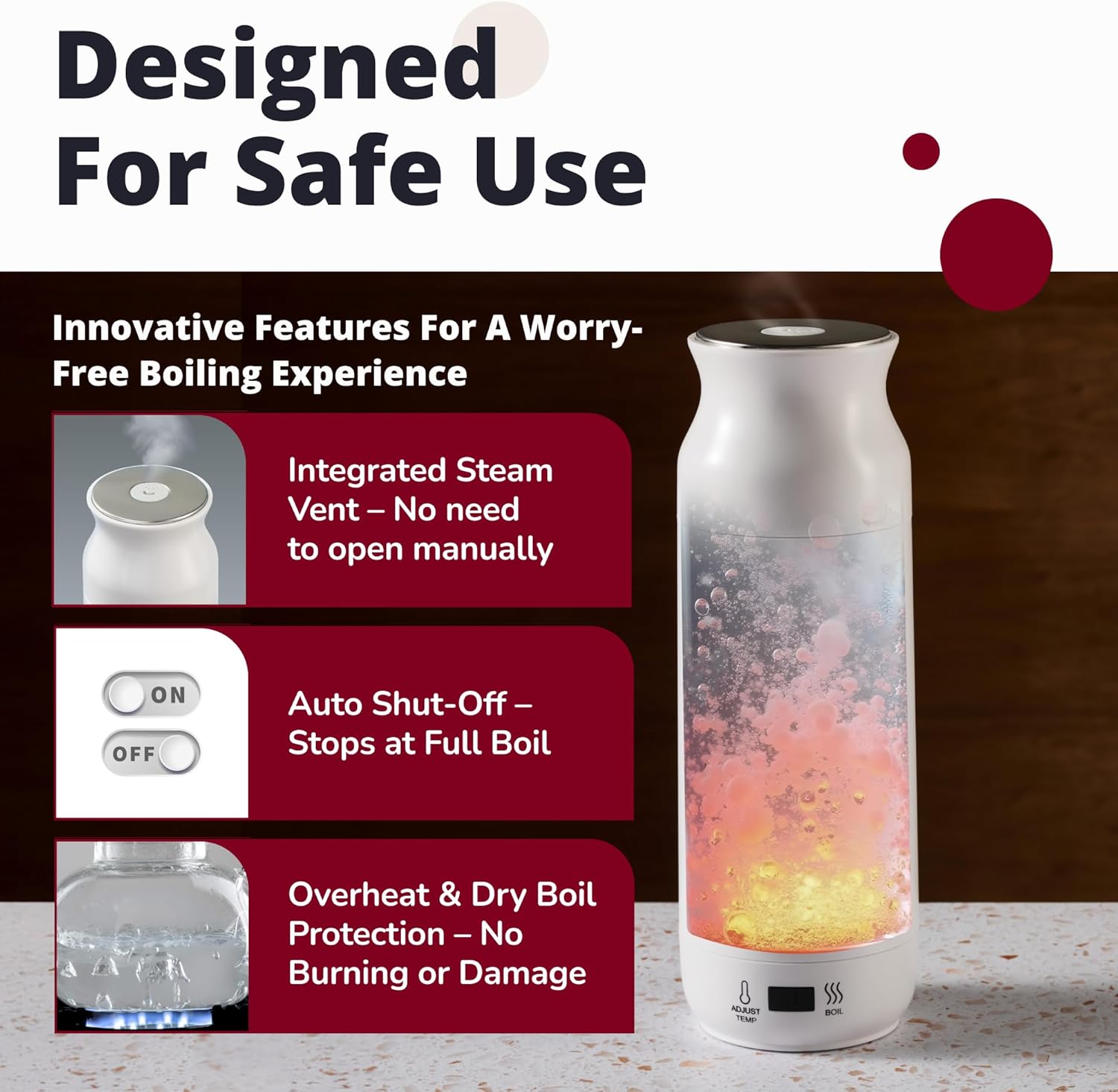 - Boil Water in an Instant - Enjoy piping hot coffee no matter where you are. With just a push of its touch button control, this electric travel kettle gives you boiling water in less than 5 minutes.