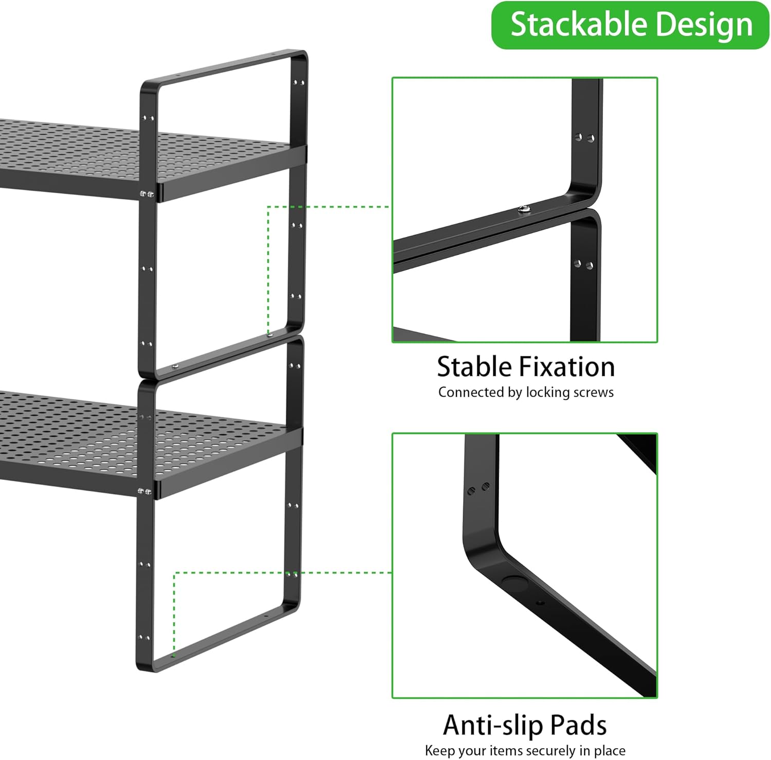 Expandable Cabinet Storage Shelf Stackable Organizer Rack for Kitchen Bathroom Pantry Spice Cupboard Coffee Countertop Home Office Desk Heavy Duty Nonslip Black Small 2 Packs