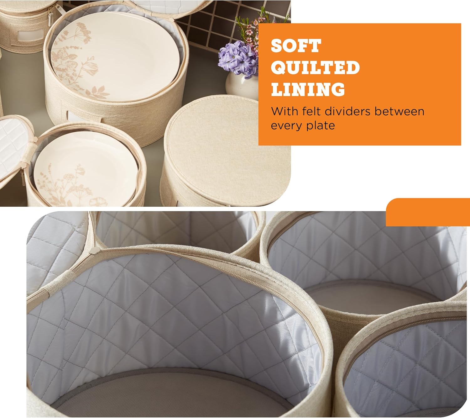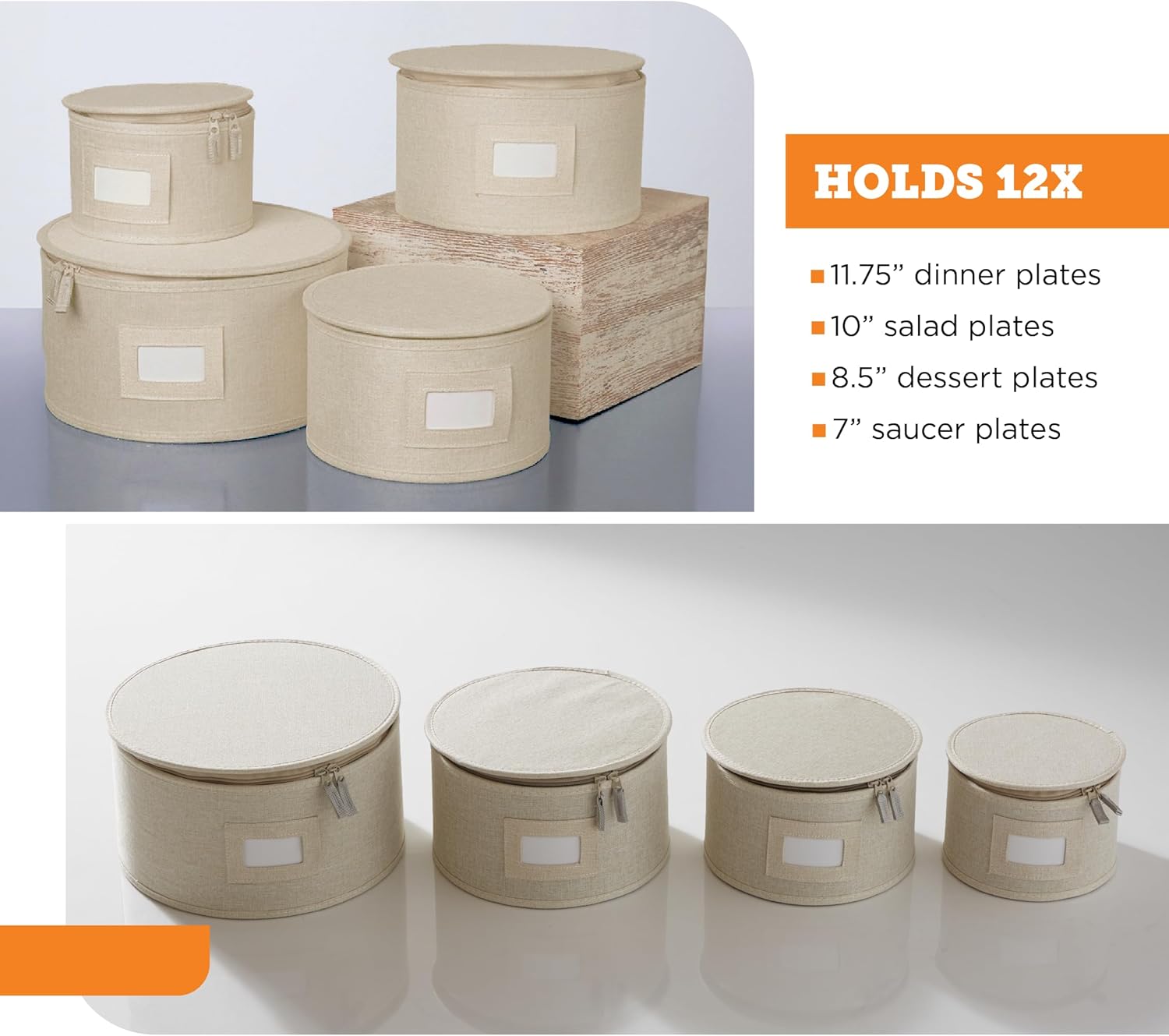 - Goodbye, Clutter. Store your dishes in one place with our stylish and stackable storage containers. Our plate storage case comes with dual zippers and label windows for easy kitchen organization.