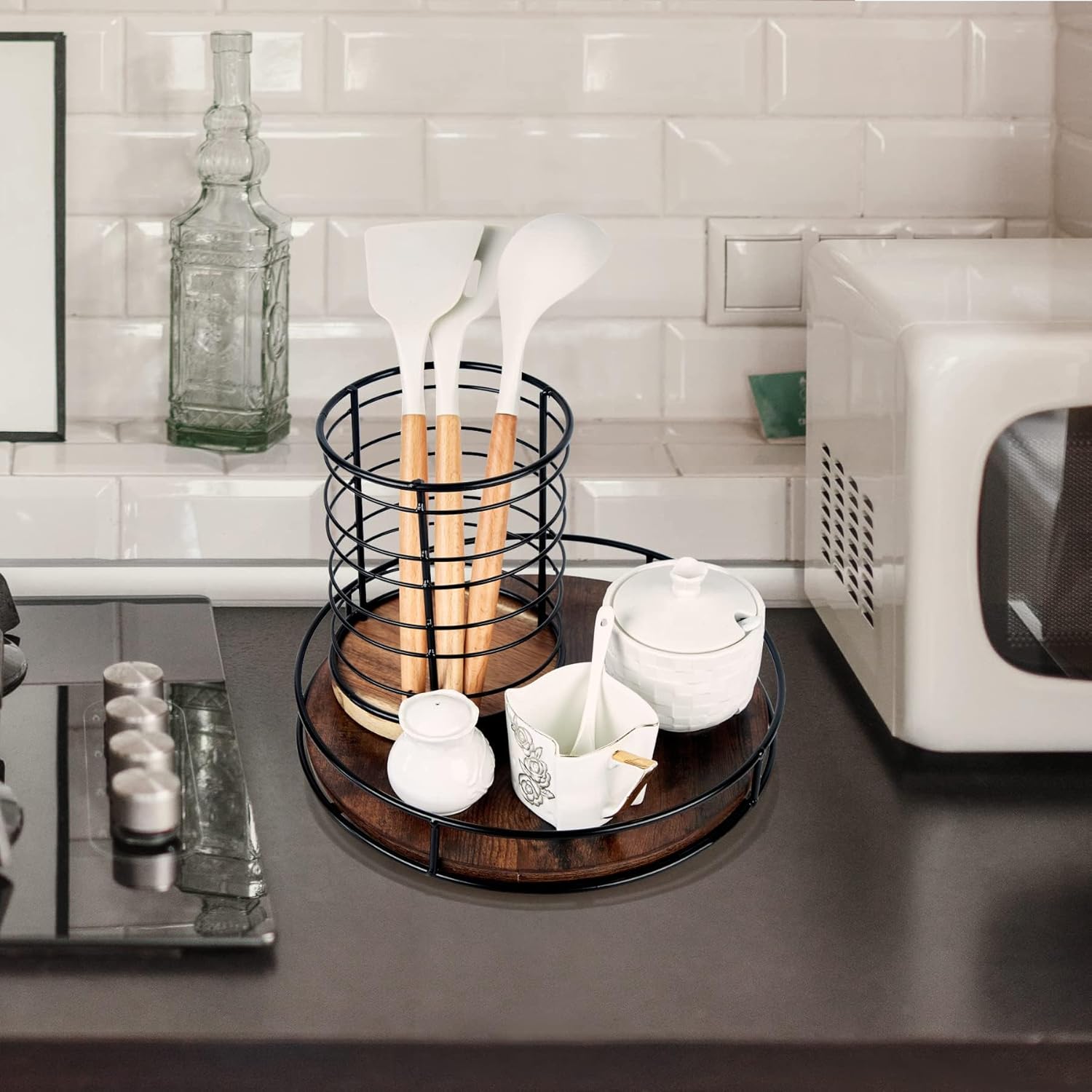 12 Inch Wood Lazy Susan, Rustic Brown Turntable Organizer with Steel Frame, 360 Degree Decorative Turntable for Countertop or Centerpieces
