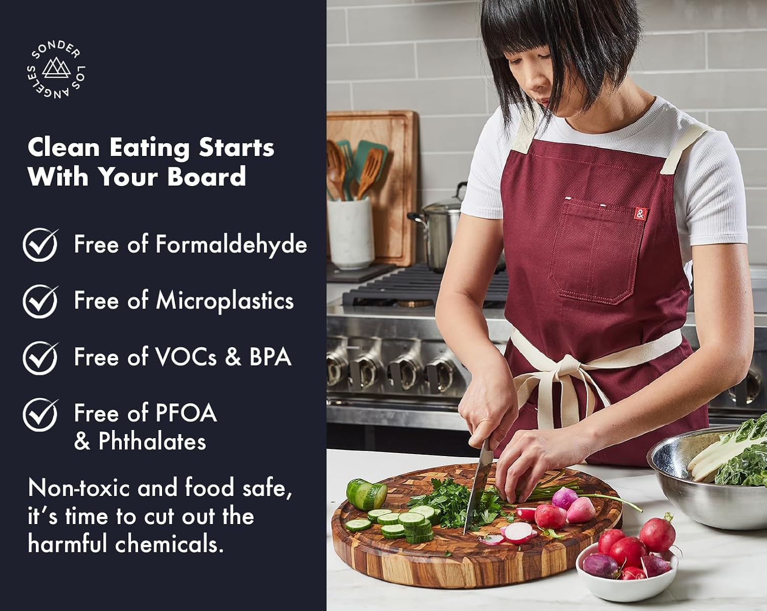 Sonder LA, End Grain Teak Wood Cutting Board 15" Round 1.5" Thick with Juice Groove and Built-in Handles, Charcuterie Serving Board (Gift Box Included)