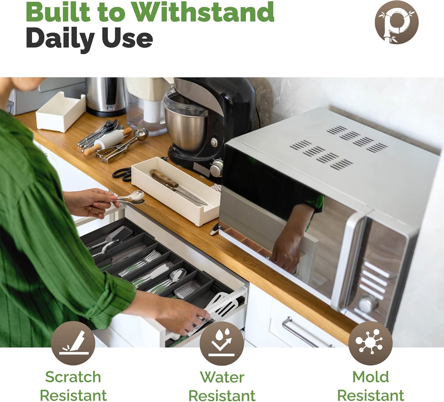 - NATURAL SLIP-RESISTANT CONVENIENCE: Our kitchen drawer organizer is made of 100% organic Moso bamboo without the use of a toxic MDF bottom that other flatware drawers use. It won’t slip around in your drawer and it doesn’t hold in moisture the way wood silverware organizers do.