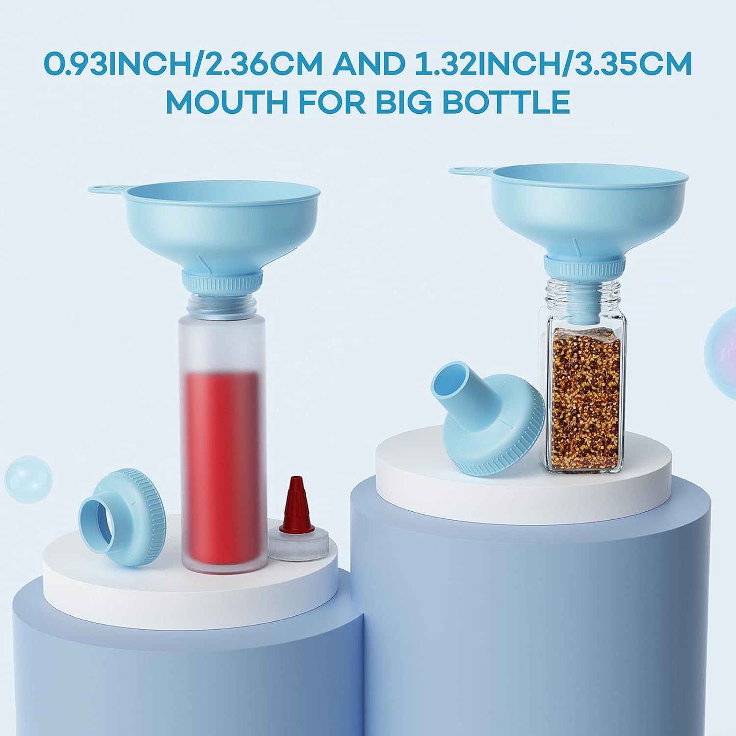 - 5 Sizes Mouth: Wide opening funnel has 5 size spouts. 2'' spout for mason jars; 1.32'' spout for squeeze bottle and pouch; 0.93'' spout for spice jars; 0.67'' spout for oil and sugar bottles; 0.44'' spout for foaming dispensers bottles