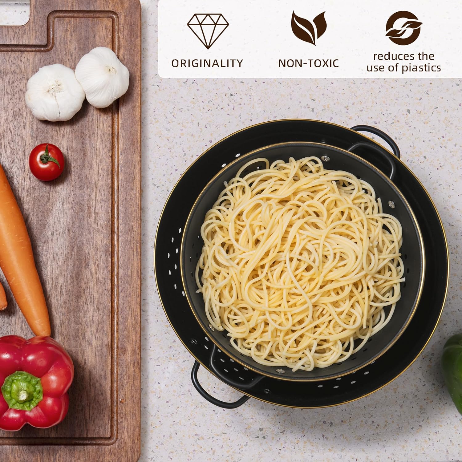 Metal Colander Set of 2, Strainer Basket with Handles perfect for Spaghetti, Pasta, Berry, Vegetable, Fruit, Solid Base Powder Coated Self-draining Kitchen Colander Bowel, 3.5 & 5 Qt, Matte Black