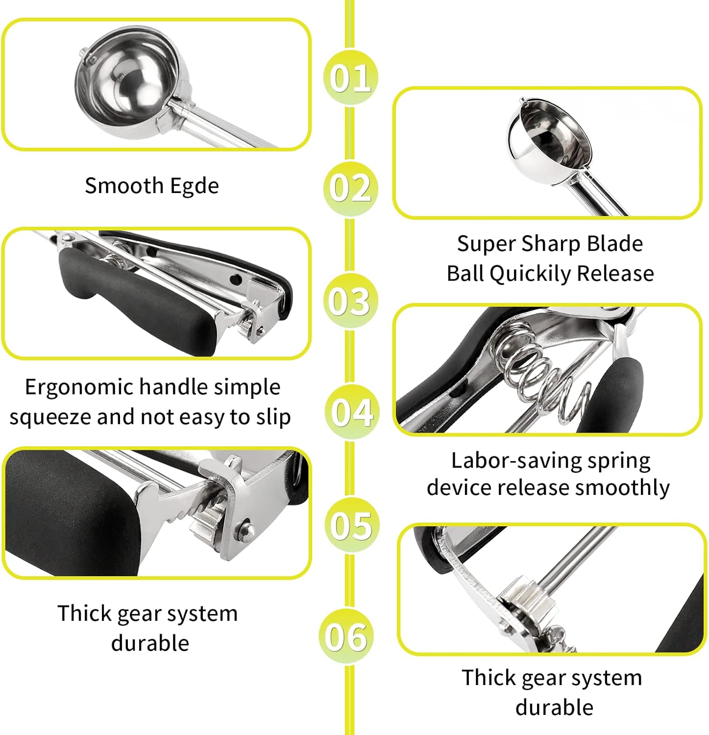 - Easy to Use: Easily make beautiful melon balls, sorbets, meat, fruits and delicious muffins, cupcakes, candy and many other round foods for healthy meals. It is suitable for scooping up and laying down ice cream, biscuit dough, meatballs, fruit balls, and also very suitable for holding pet food.