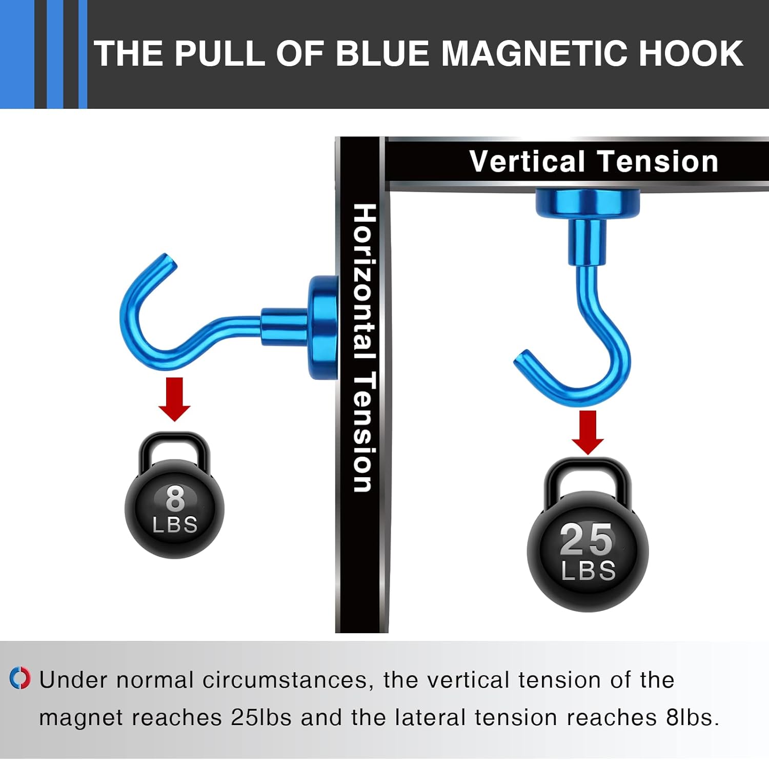 - 【INDUSTRIAL GRADE】: 25 lbs tension of blue magnetic hook is based on the direction of tension perpendicular to the contact surface -- reduced by 2/3 if magnet hooks are used horizontally.Please note that the tension of the magnet hook is also affected by the direction, the material of the contact surface and other factors.