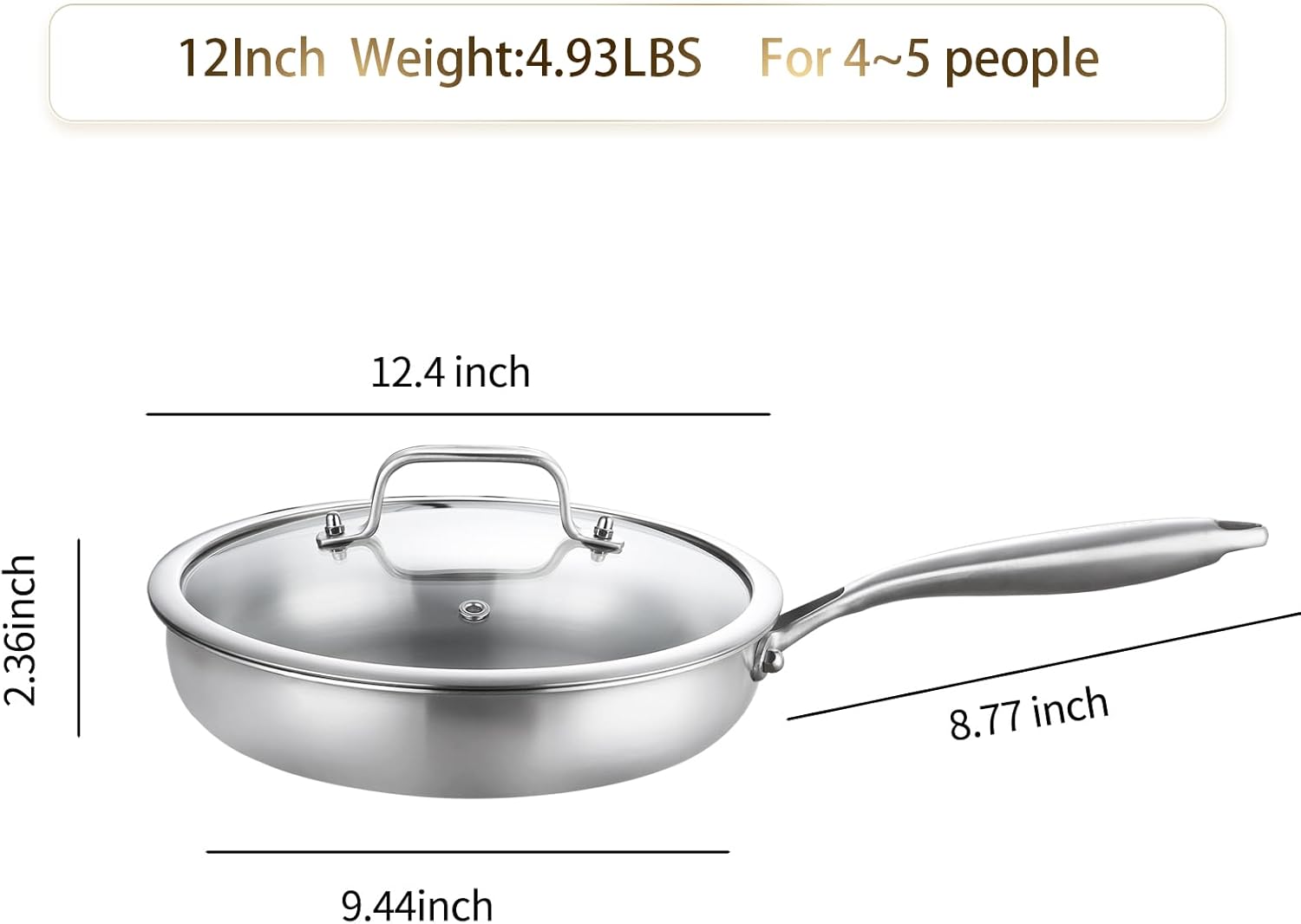 - 【DURABLE & HEAVY DUTY】DELARLO 12 inch Stainless Steel Frying Pan is Not Only Durable and Heavy-Duty But Also Enables Its Body to Withstand a High Temperature of Up To 600°F. The Sturdy Hollow Handle Design Reduces Heat Transfer. The Clear Tempered Glass Lid Stays On Tight, Making It Easy To Monitor Your Meals at All Times.Featuring a Steam Vent For Safety, And a Sturdy Hollow Handle Design To Reduce Heat Transfer