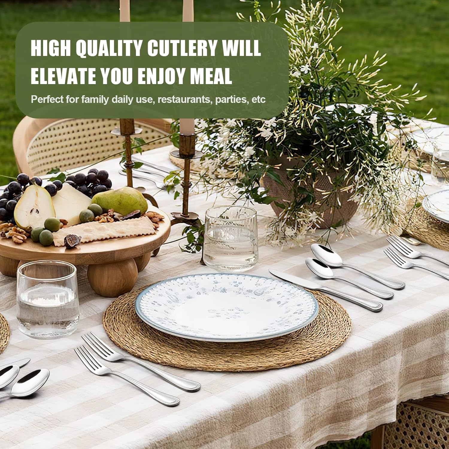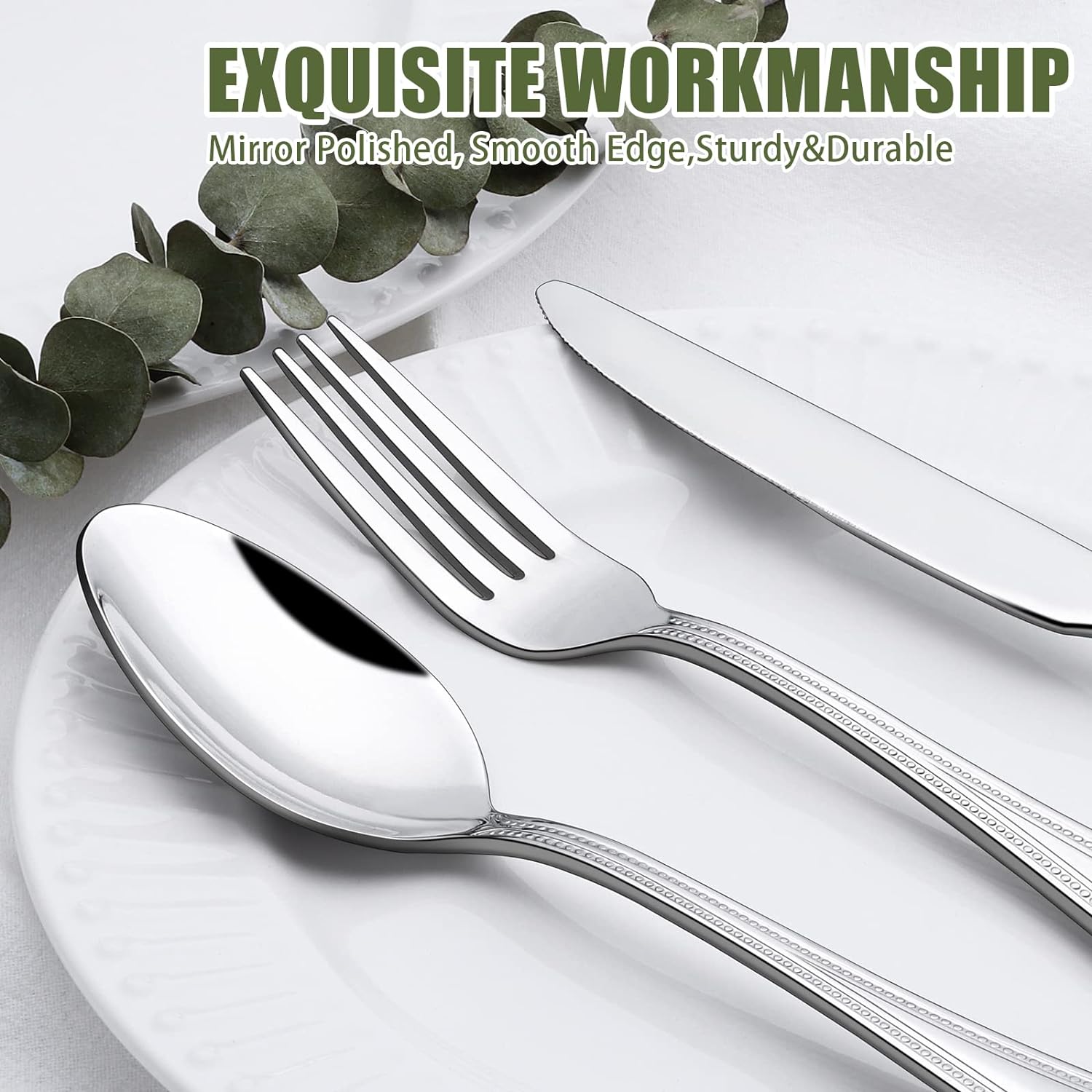 - ăADD ELEGANCE TO TABLEăThis cutlery set is a nice compromise between modern and classic thanks to its sleek, simple beaded design and bright mirror finish. Whether your style is traditional or modern,this flatware will complement your decor and never look dated. The elegant utensil set is perfect for family daily use, parties, family dinner, wedding, hotel, restaurant, formal dinner, etc.