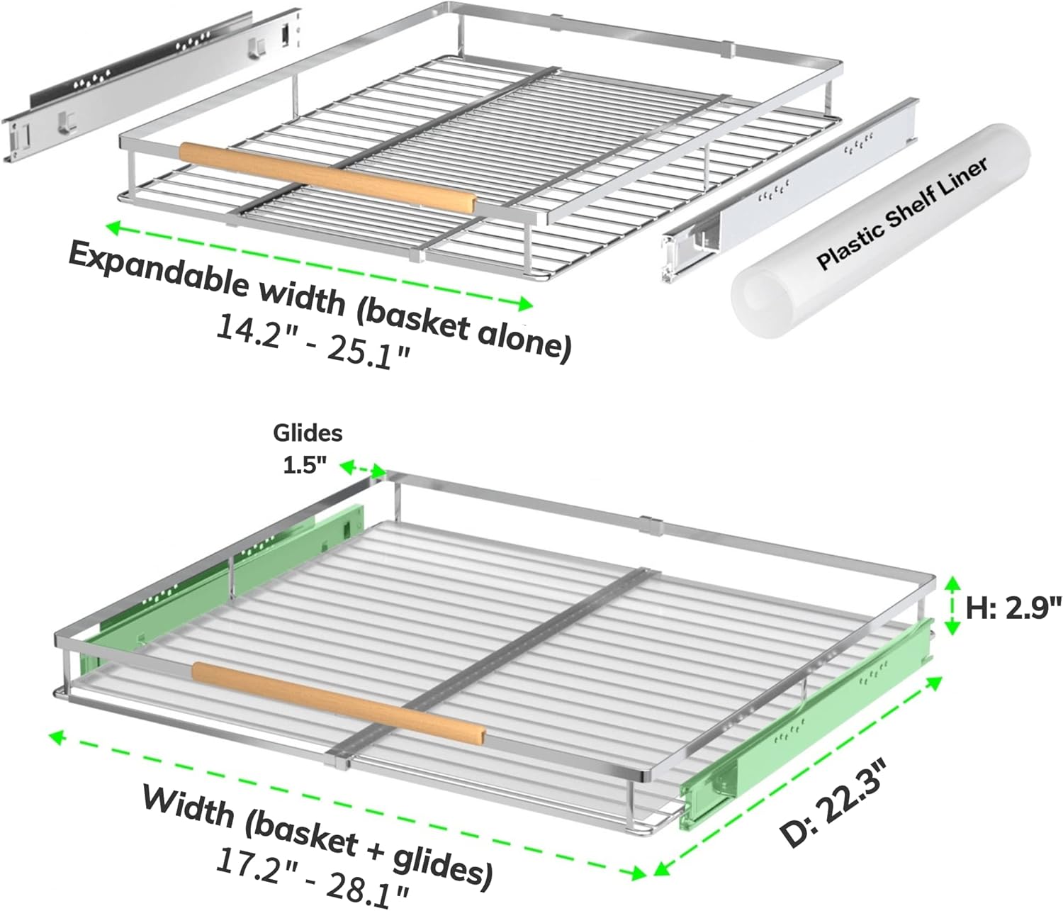 - EXPANDABLE DESIGN: This pull out cabitnet shelf is designed to fit in most cabinets. The width of the wire basket can be adjusted from 17.2“ to 28.1”. The new expandable design gives you a better experience and saves your space