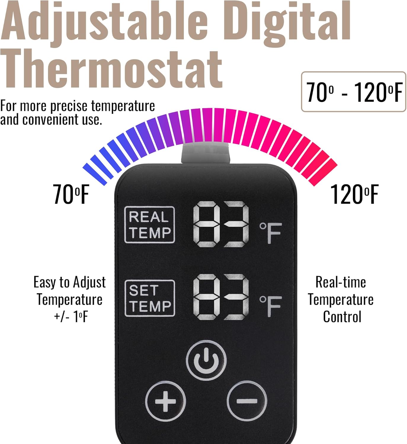 - 70°F -120°F Thermostat Controlled: Warming Mat accurately raises the temperature to a maximum of 30⁰F above ambient room temperature.