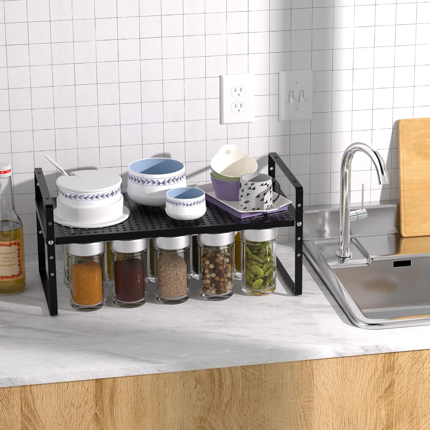 - ăExpandable and stackable designă--The Adjustable Countertop Organizer (collapsed) measures 16.5" L x 10.2" W x 9.8" H, expands from 16.5" to 27.5" wide. You can also stack two shelves together to create a two-tier storage space.