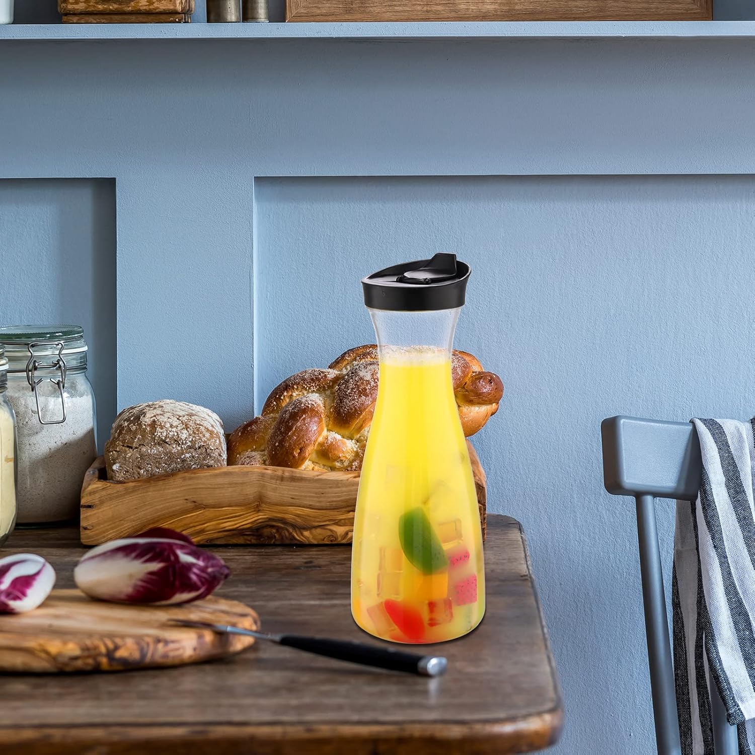 - Large Quantity: you will get 12 pieces of 34 oz/ 1 liter juice pitchers, which can meet your party, gathering, banquet and other activities, lightweight plastic juice jugs, not as heavy as glass materials, classic style with lids reusable pitcher is nice for entertaining