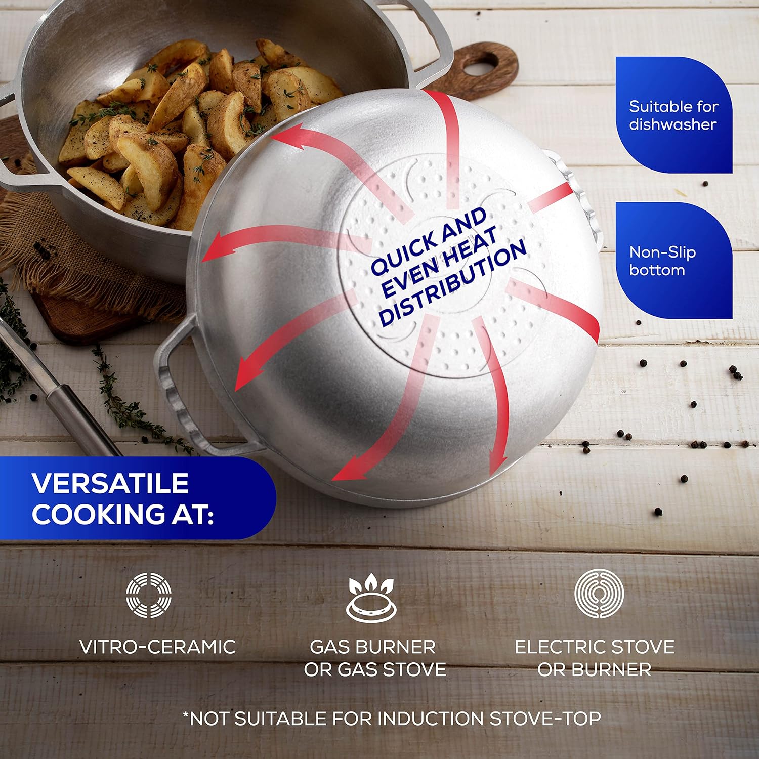 - 🔒 Designed for Everyday Safety & Convenience: This 6.3 QT caldero is packed with features that enhance safety and usability in regular home kitchens. It includes a non-slip bottom for stable cooking, ergonomic, stay-cool handles for a secure grip, and a drip-free lid with a wide, heat-resistant knob to prevent accidental burns. Perfect for gas, electric, and vitroceramic stoves, making it a reliable choice for home cooks.