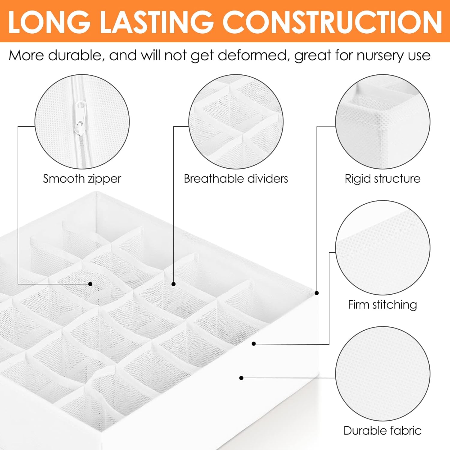 6 Pack Sock Underwear Drawer Organizer Dividers, 58 Cell Foldable Fabric Dresser Closet Organizers and Storage Bins for Clothing, Baby Clothes, Bra, Panty, Scarf, Ties (White)