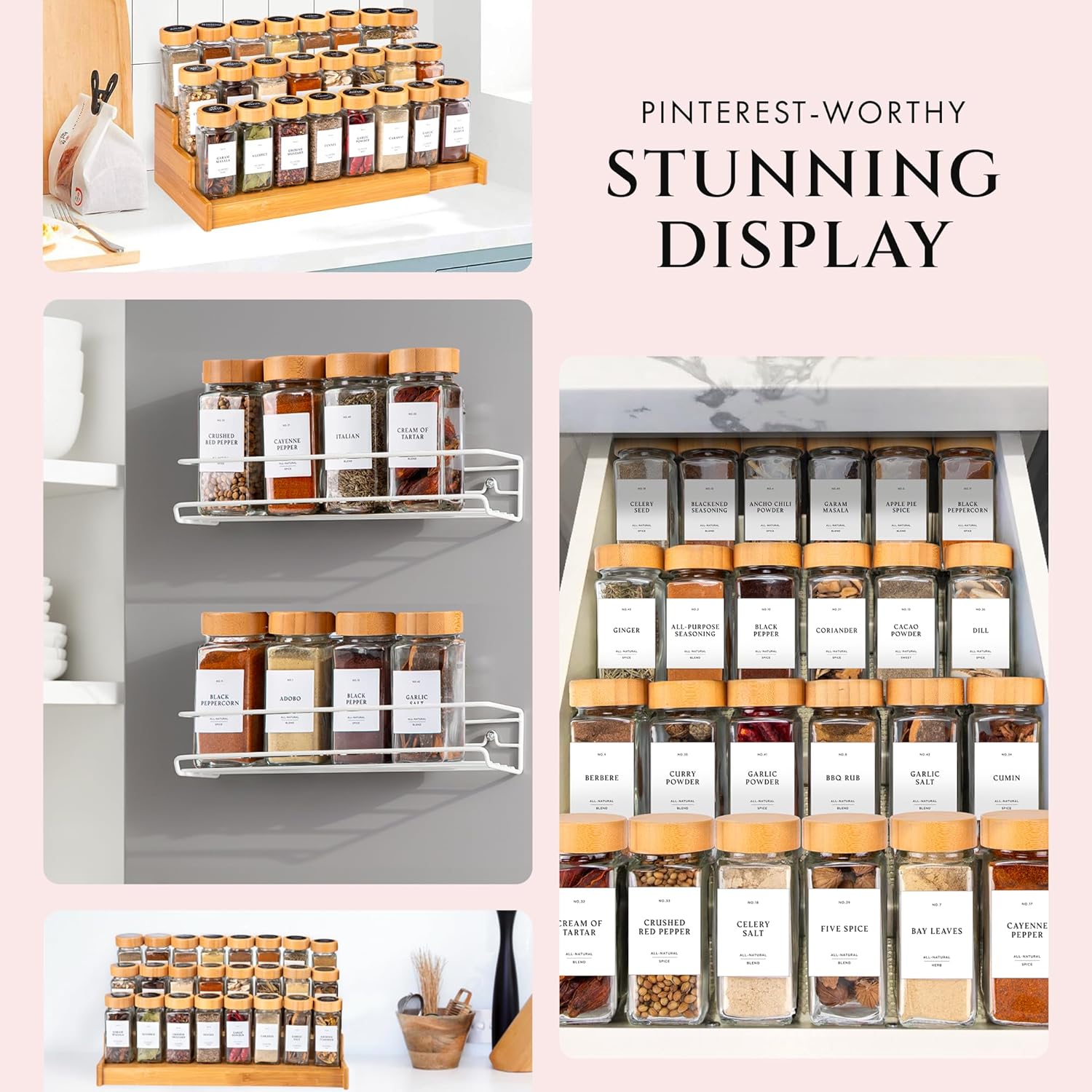 - A KITCHEN MADE FOR THE GRAM: Transform your kitchen with our 24-pack bamboo spice jars glass, including 24 jars for spices, 240 spice labels, and a collapsible silicone funnel. This labeled spice jars ensures your spices are neatly organized and easily accessible, creating a sleek, Instagram-worthy kitchen space