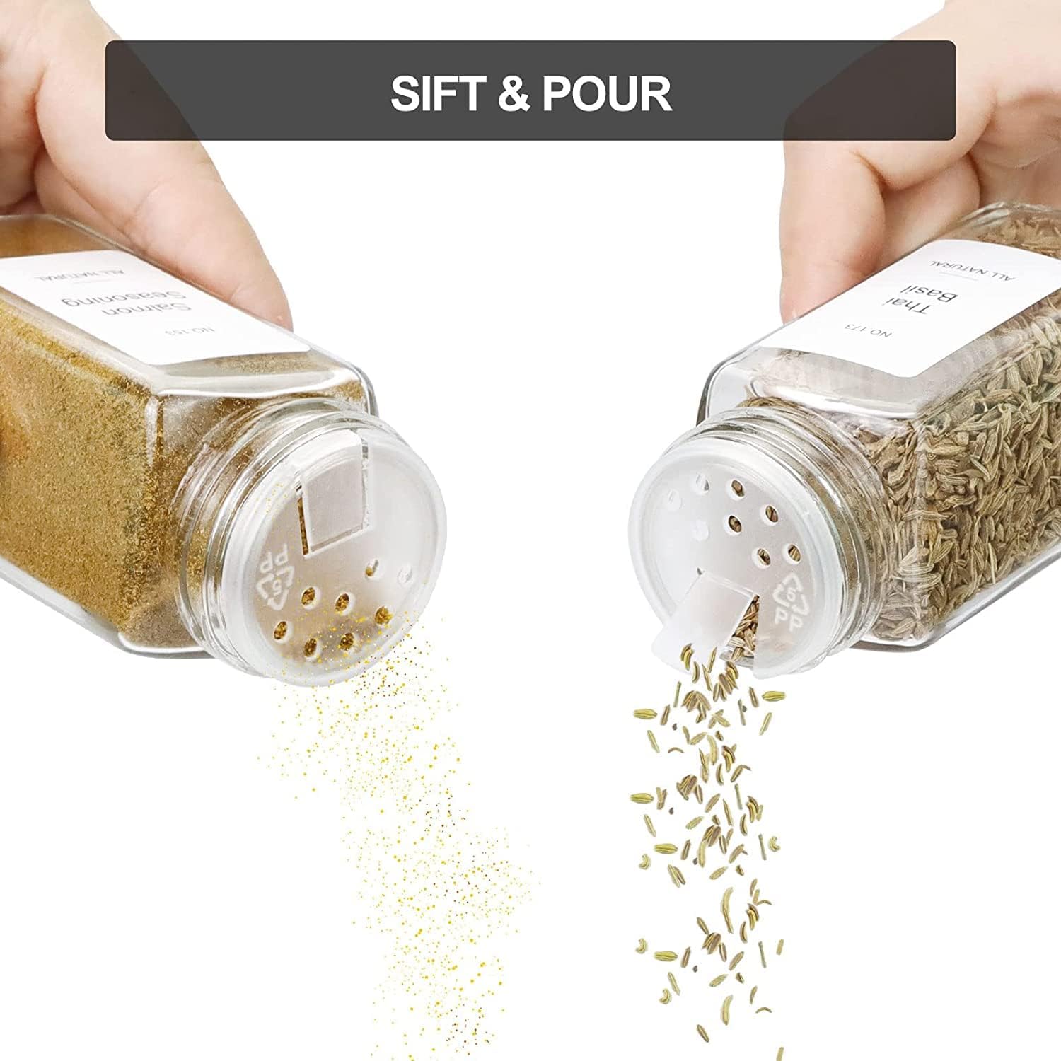 - 18 Glass Premium Spice Jars: Spice jars are made of lead-free glass,safe and shatter-resistance.18 dual functioning sift and pour lids; let you shake or use spoons to measure. The airtight aluminum caps protect prepared spices not exposed to air, keeping spices aromatic and flavorful.